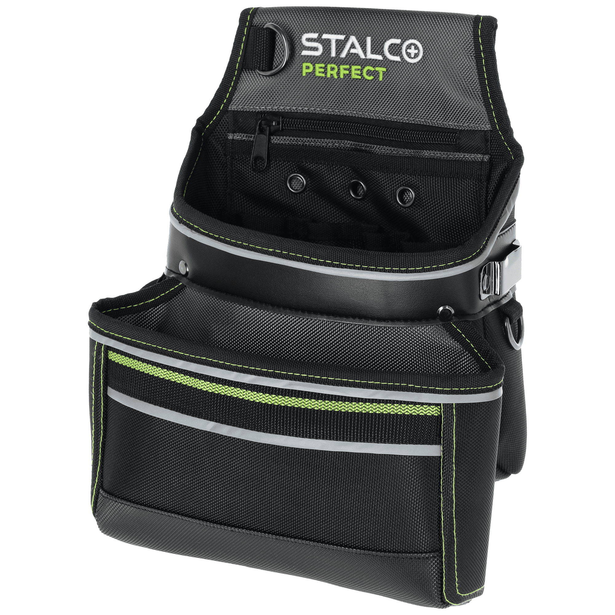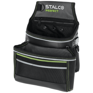 Kieszeń narzędziowa "KNP12" będzie przydatna w czasie prac monterskich i serwisowych. Jest to funkcjonalny dodatek przeznaczony do przechowywania podręcznych narzędzi i akcesoriów. Jej konstrukcja pozwala na zawieszenie na pasie i daje dogodny dostęp do zawartości. Wysoka jakość zastosowanej tkaniny poliestrowej sprawia, że trwałość produktu w trudnych warunkach budowlanych jest bardzo wysoka. Materiał nie ulega uszkodzeniu przy przetarciach i jest odporny na przebicie, co pozwala na bezpieczne przechowywanie akcesoriów o ostrych krawędziach. Newralgiczne miejsca dodatkowo wzmocniono nitami, co zapobiega rozerwaniu. Kieszeń narzędziowa z linii STALCO Perfect jest podzielona na dwie duże komory o sporej pojemności. Znalazła się w niej również kieszonka wewnętrzna zapinana na suwak. Na zewnątrz umieszczono uchwyt na miarę i metalowe oczka na klucze.