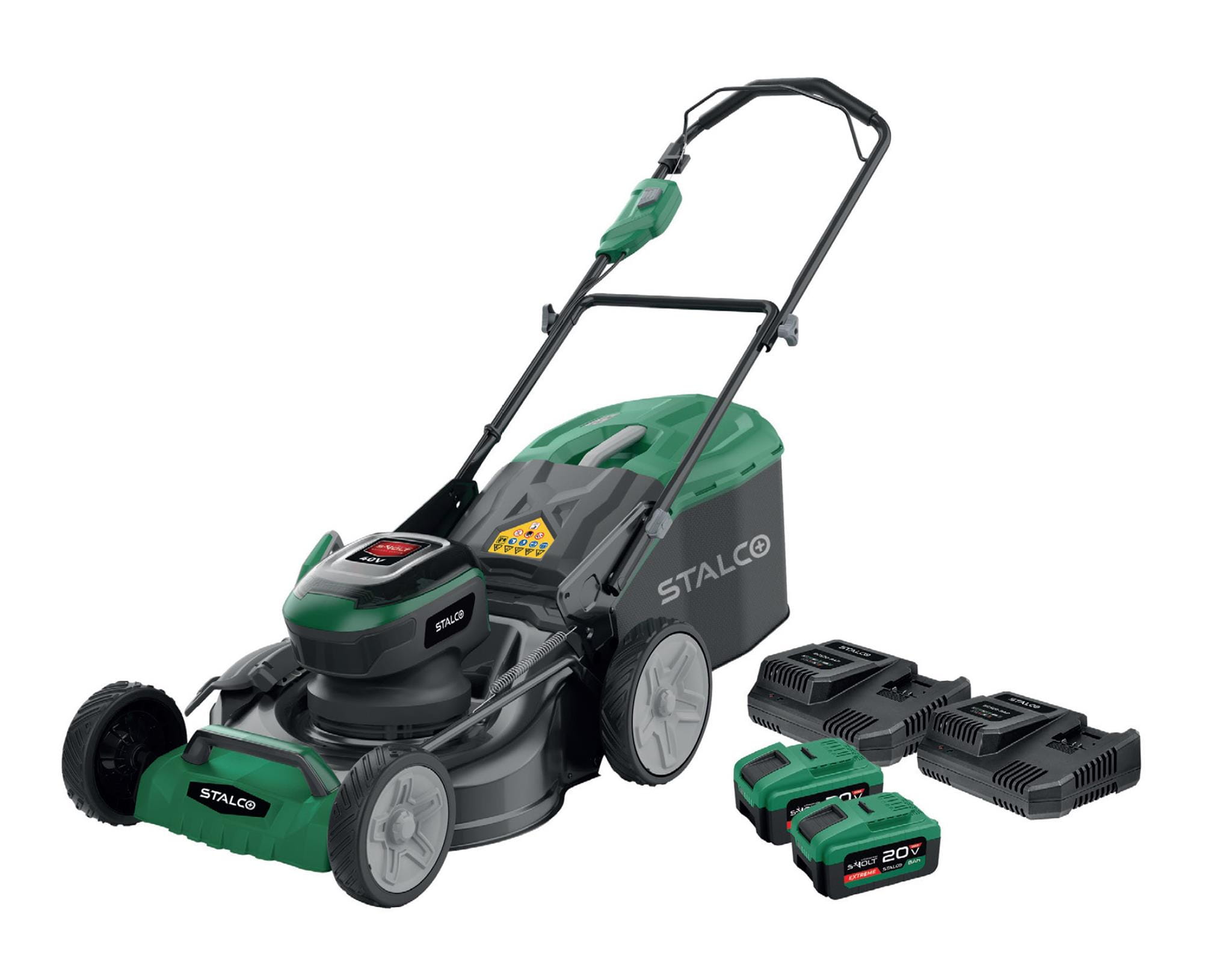 Zestaw z kosiarką akumulatorową można zastosować w dowolnym miejscu bez względu na dostęp do infrastruktury energetycznej. Do kompletu dodano dwa pojemne akumulatory 8Ah, które zapewniają długą pracę bez konieczności ładowania. Zestaw zawiera też dwie szybkie ładowarki, dzięki którym w krótkim czasie można ponownie naładować akumulatory. Zarówno baterie, jak i ładowarki są kompatybilne z innymi urządzeniami i akcesoriami STALCO lini S-Volt