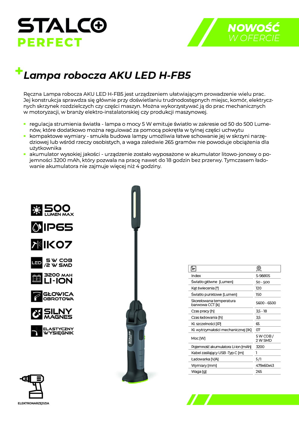 Lampa robocza ; aku led ; H-FB5 STALCO PERFECT S-98805