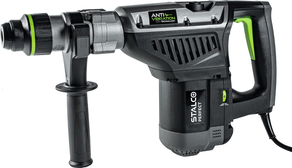 Młot udarowo-obrotowy SDS-MAX STALCO oferowany jest w zestawie z ogranicznikiem głębokości wiercenia, dodatkowym uchwytem, a także smarem i szmatką do pielęgnacji.