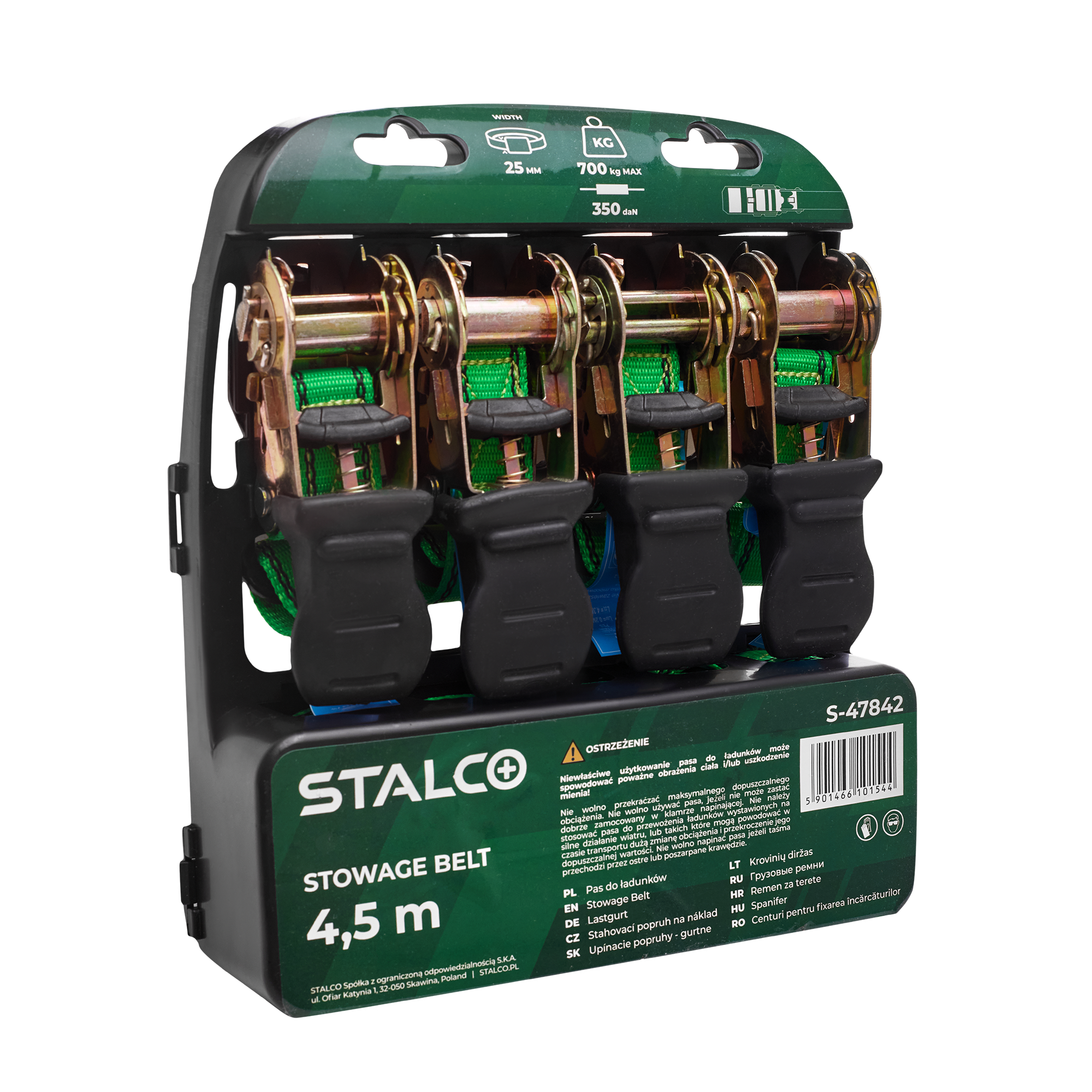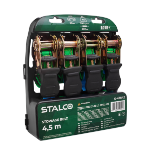 Pasy do ładunków to akcesoria wykorzystywane głównie w transporcie. Mają za zadanie zabezpieczyć towar znajdujący się na pace samochodu. Można zamocować nimi załadunek do burty auta. Sprawdzą się też przy spinaniu w całość kilku produktów. Szczególnie przydatne będą przy przewożeniu ciężkich konstrukcji, urządzeń, a nawet innych pojazdów. Pasy do ładunków STALCO są wykonane z włókien poliestrowych. Materiał jest odporny na wilgoć, promienie słoneczne, a także przetarcia i przebicie. Pojedynczy pas wytrzymuje obciążenie nawet do 700 kilogramów. Pasy mają dwuczęściową konstrukcję, co ułatwia mocowanie produktów o różnych wymiarach. Cały zestaw ma długość 4,5 metra. Pasy do ładunków składają się z haka i masywnej klamry z mechanizmem zapadkowym. Oba elementy są wykonane z trwałej stali węglowej i zabezpieczone lakierem oraz warstwą cynku. Dodatkowo klamra ma uchwyt pokryty tworzywem sztucznym. Jest wygodny w czasie zaciągania i chroni wnętrze pojazdu przed zarysowaniem. Pasy dostępne są w komplecie 4 sztuk o jednakowych wymiarach.