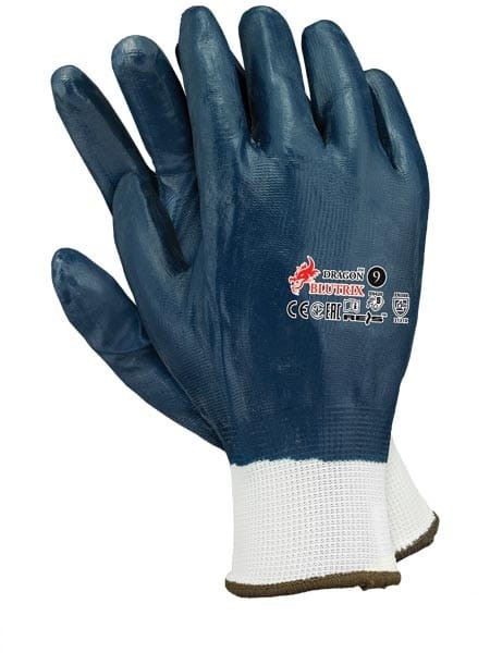 - część wierzchnia i chwytna oblewana powłoką z nitrylu w kolorze granatowym