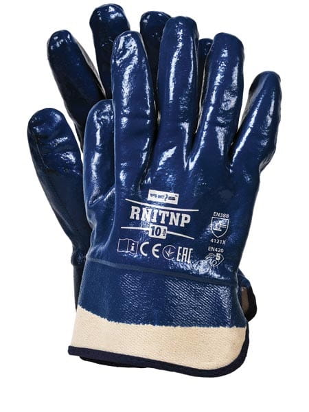 Rękawice ochronne powlekane nitrylem, zakończone usztywnianym mankietem.