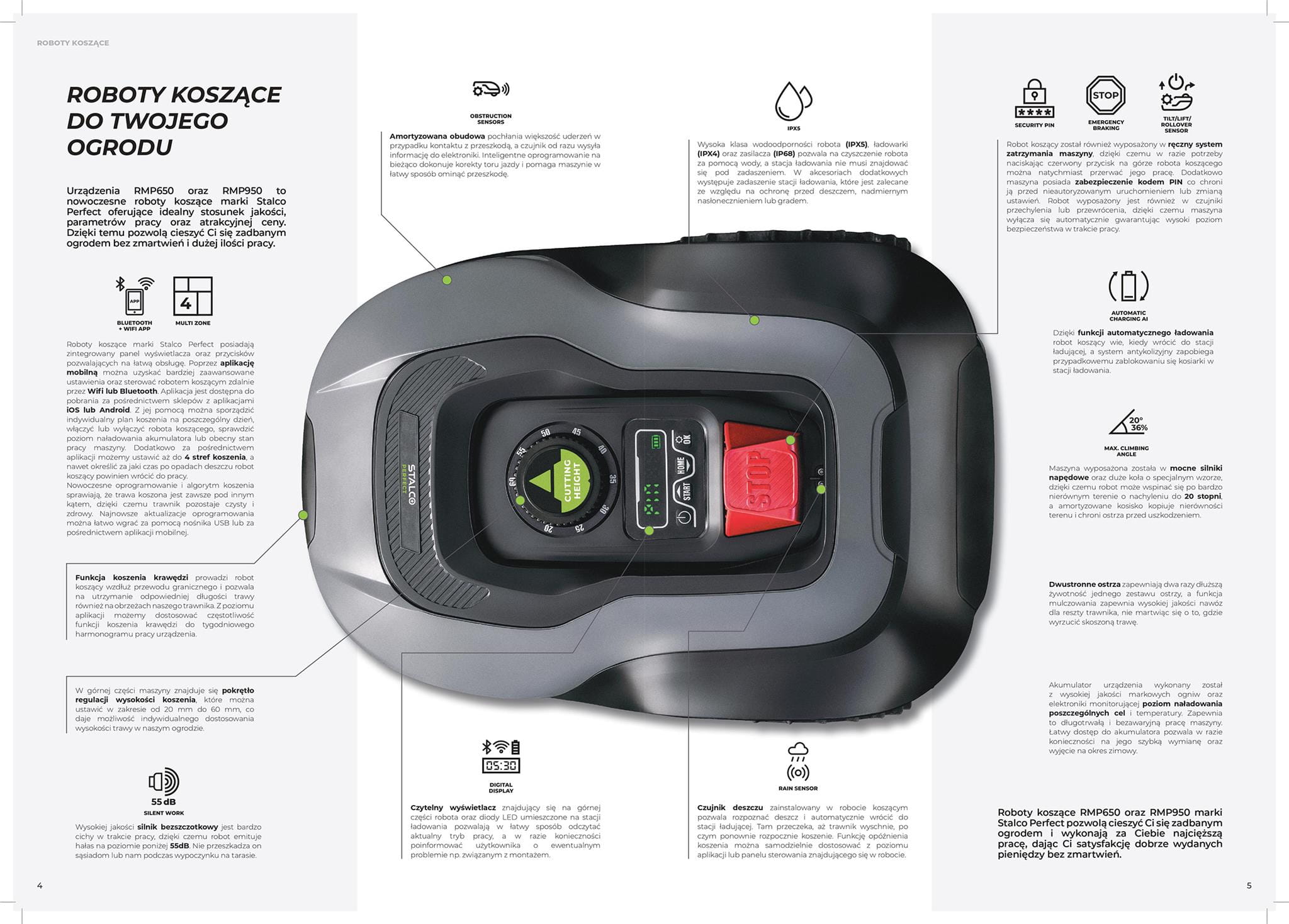 Robot koszący RMP650 STALCO ma regulację wysokości koszenia w 5 poziomach. Pozostawi trawę o wysokości od 20 do 60mm w zależności od wybranego ustawienia. Robot może pokonywać wzniesienia o nachyleniu nawet do 36%. Jego wymiary pozwalają na wykoszenie przejść o szerokości minimum 80cm. Jest wyposażony w szereg czujników, które zapewniają bezpieczeństwo pracy. Do najważniejszych należy sensor deszczu. Robot automatycznie wraca do bazy po zakończeniu pracy.