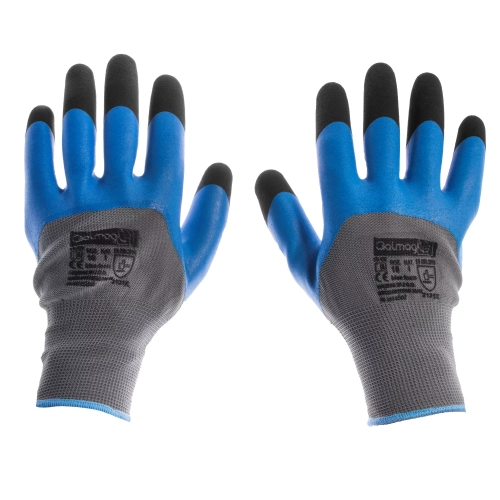 Rękawice ochronne, wykonane z dzianiny poliestrowej w kolorze szarym, powlekane spienionym lateksem w kolorze niebieskim, bezszwowe, zakończone ściągaczem. Końcówki palców dodatkowo oblane spienionym, szorstkowanym lateksem w kolorze czarnym. Zgodne z: EN ISO 420:2003, EN ISO 388:2016.