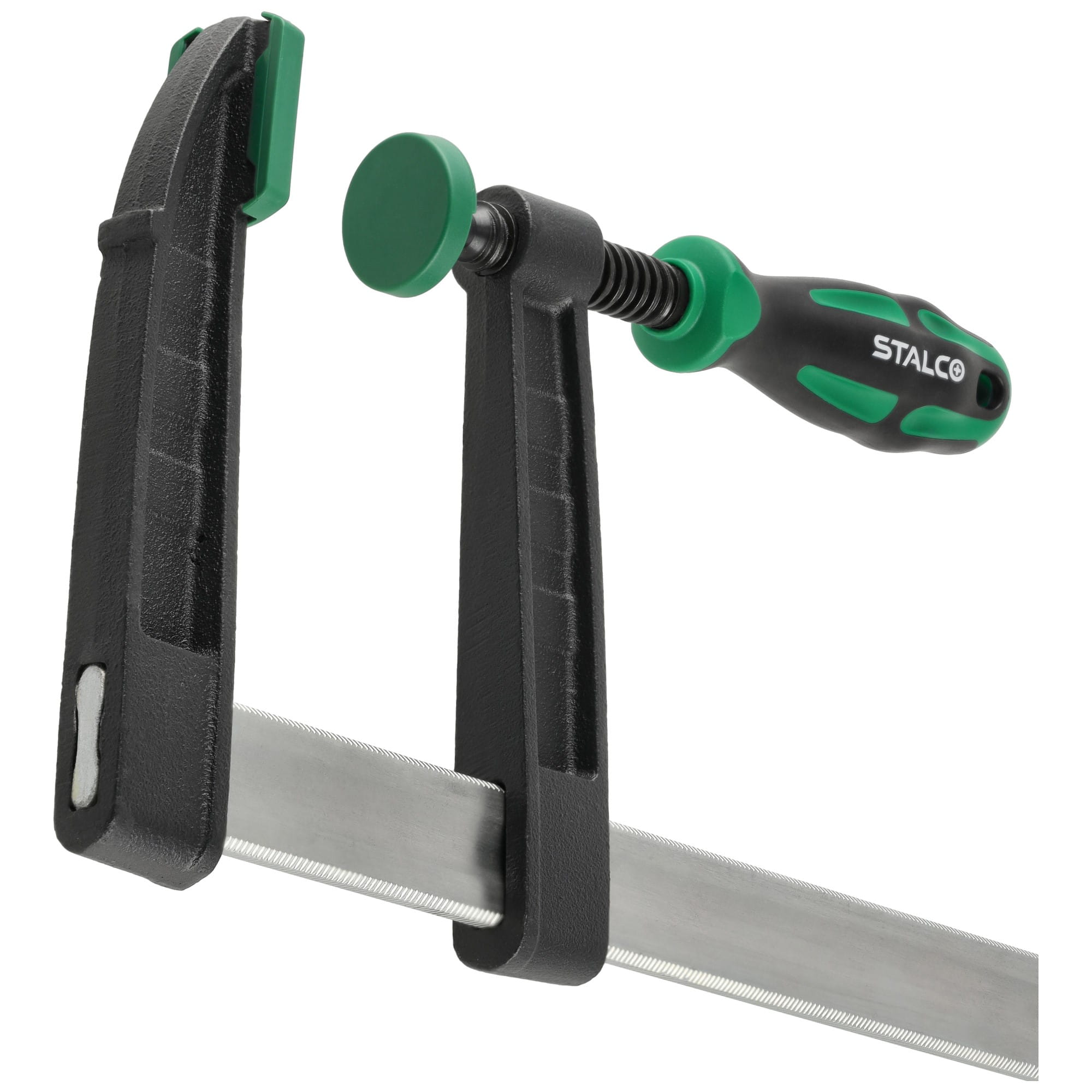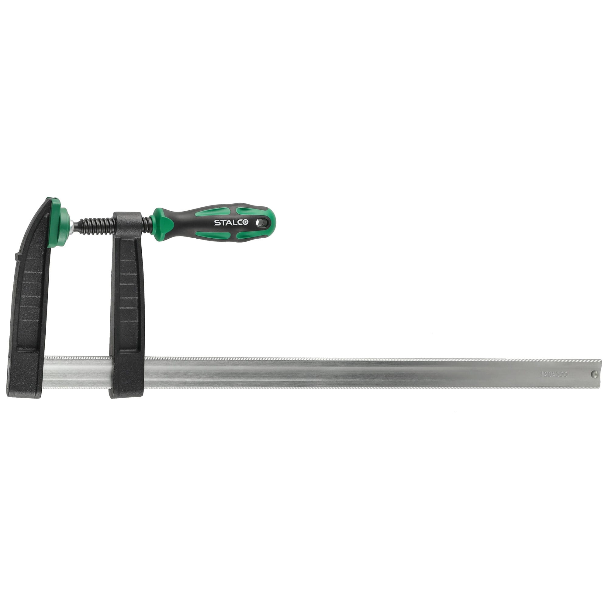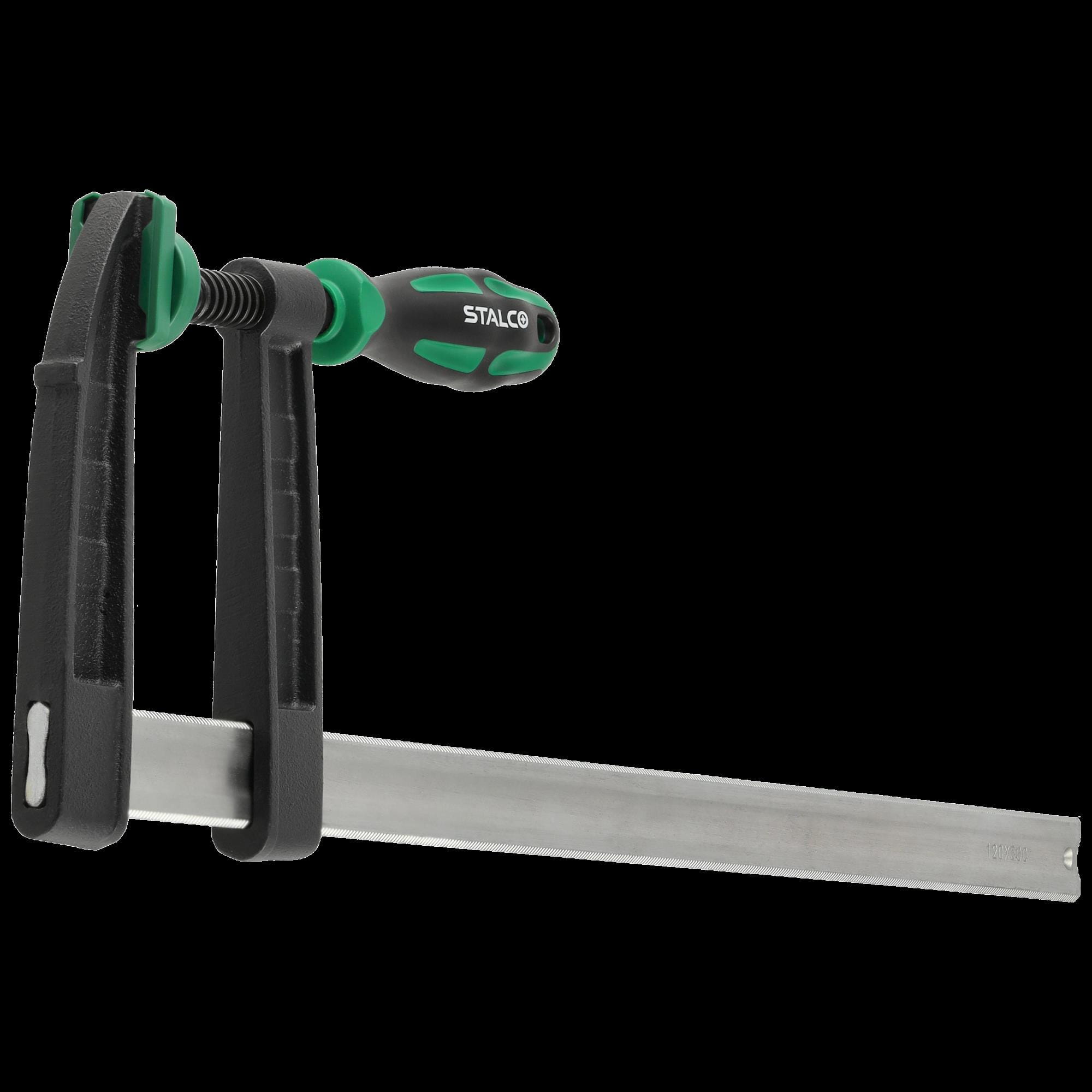 Ścisk stolarski STALCO 120x500, siła ścisku : 470kg, wyposażony we wzmocnioną stalową, rowkowaną, ocynkowaną prowadnicę, szczęki wyposażone w nakładki z wysokiej jakości tworzywa sztucznego, dwumateriałowy ergonomiczny uchwyt pozawala na łatwe dozowanie siły docisku.