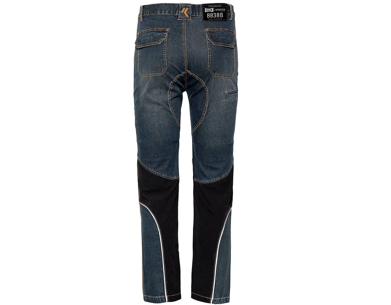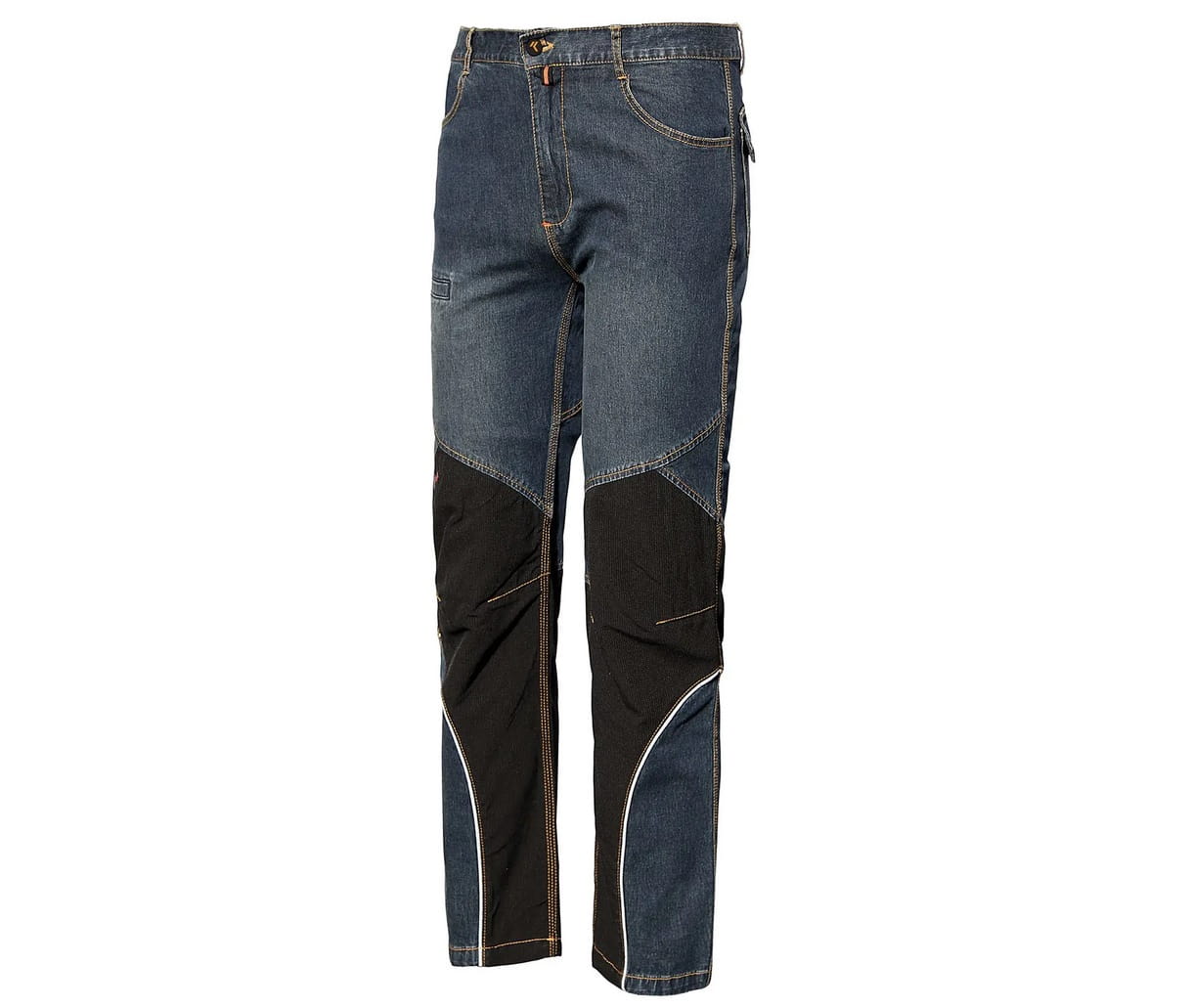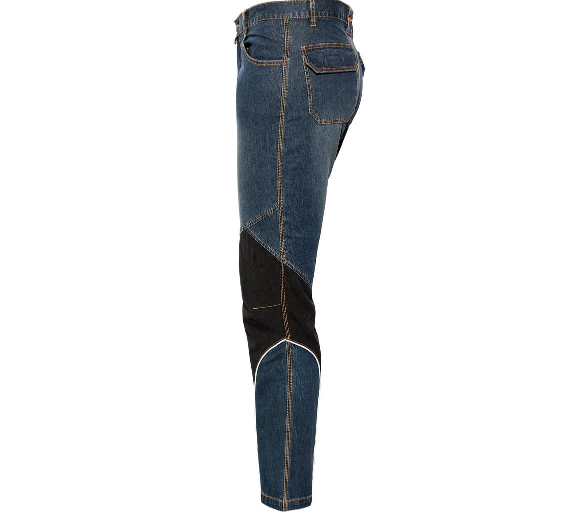 Jeansy o sportowym kroju ze wstawkami z materiału odpornego na przetarcia, które wraz ze wzmocnieniem w okolicy pośladków zwiększają wytrzymałość tego modelu. Cztery kieszenie, kieszeń na telefon komórkowy i kieszeń na miarkę są ukryte.