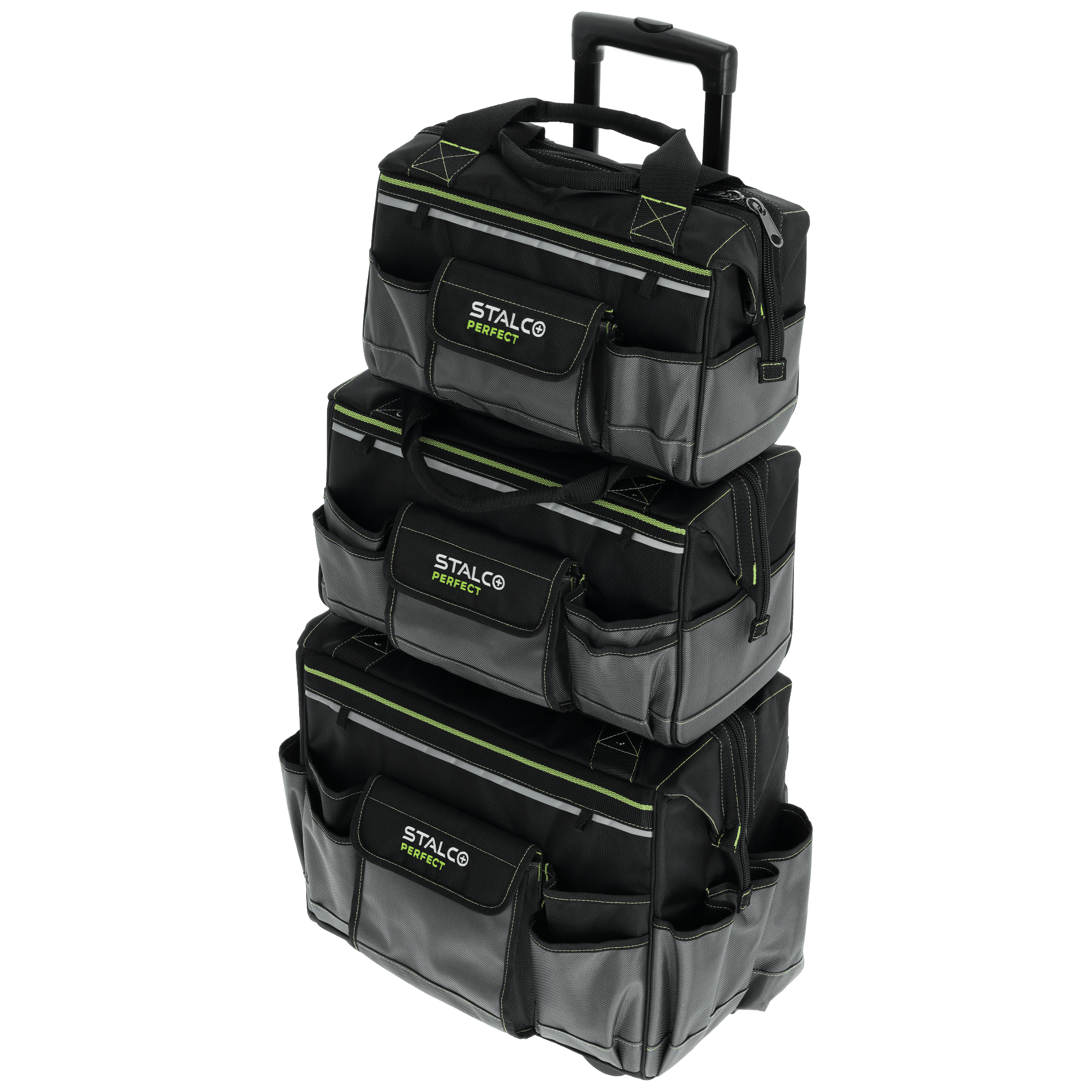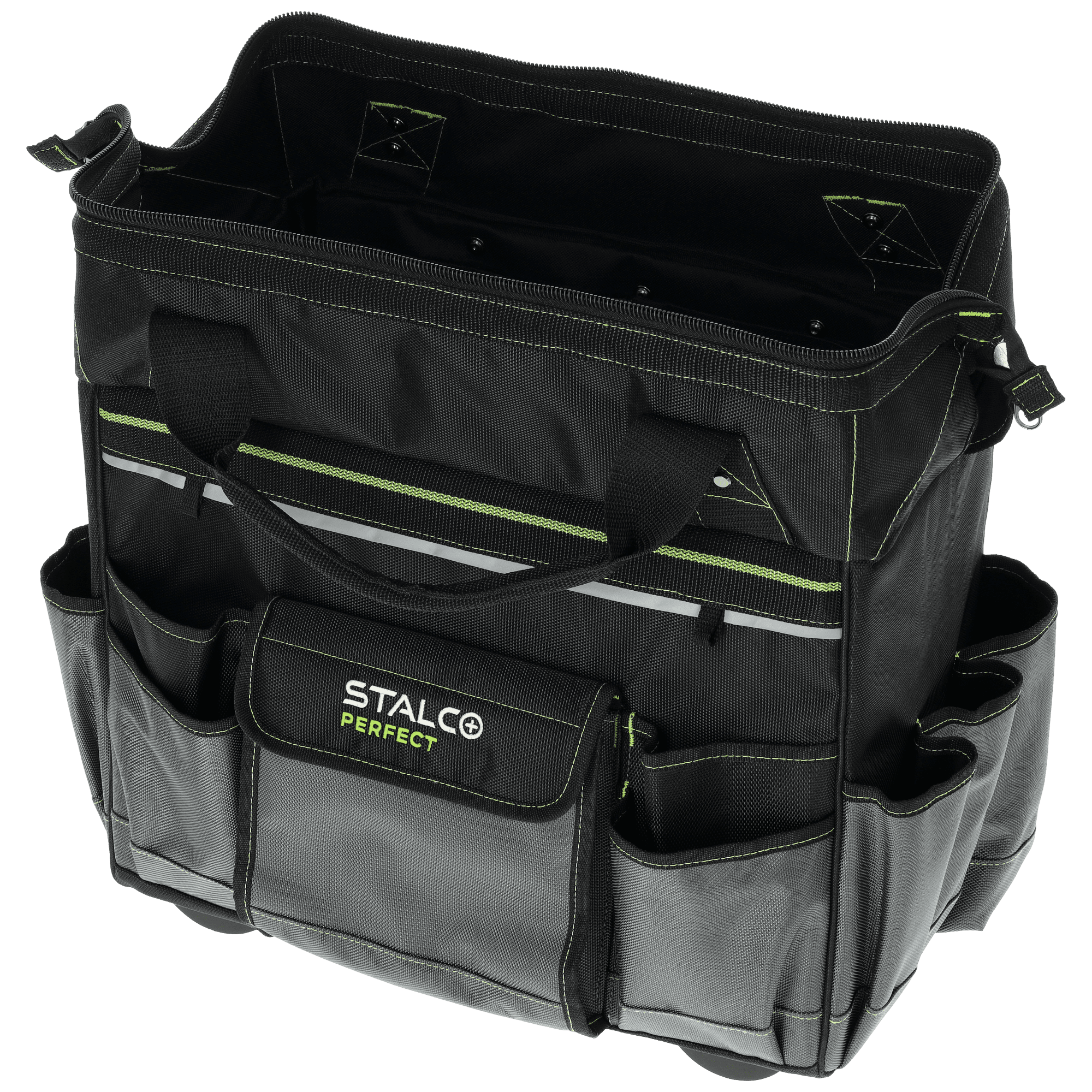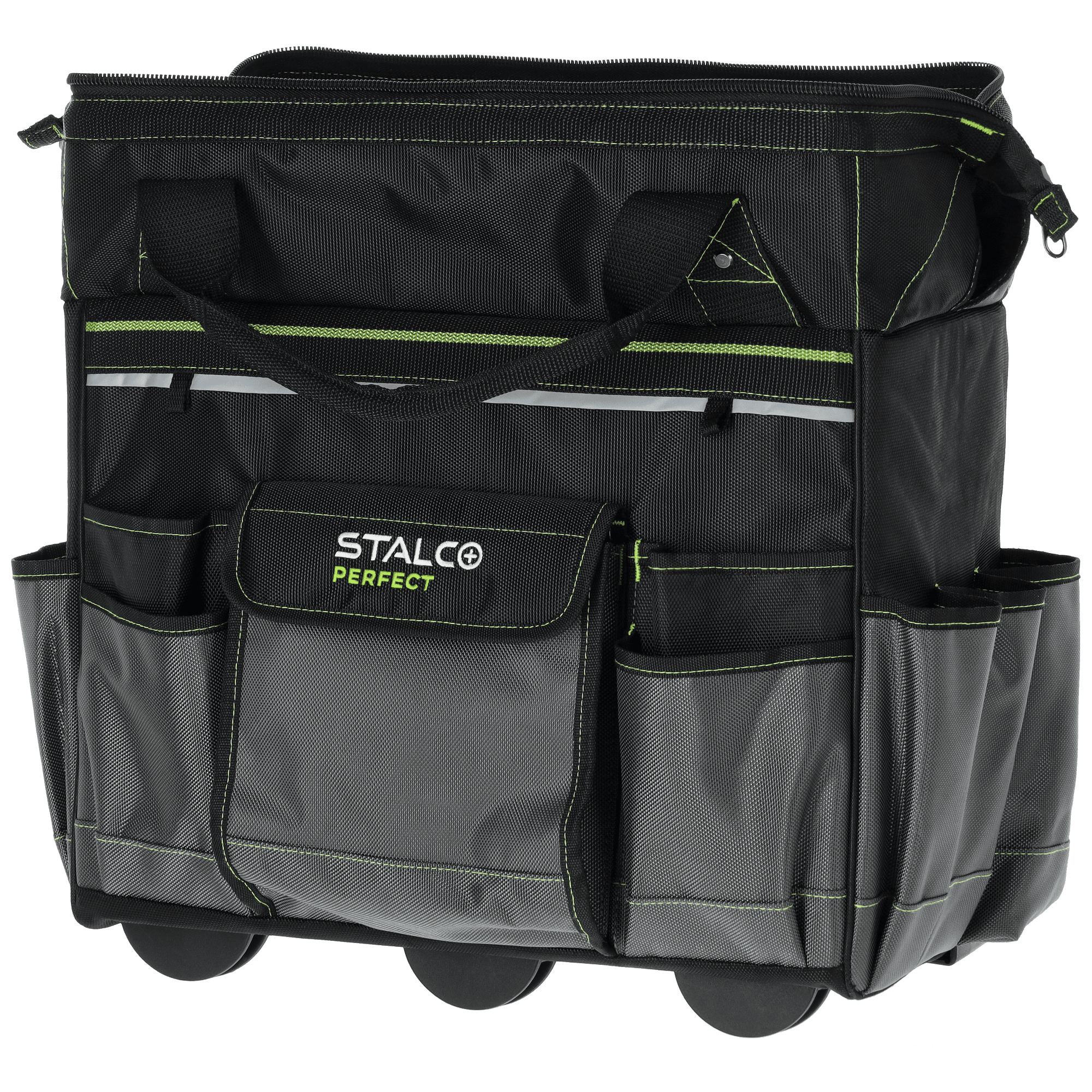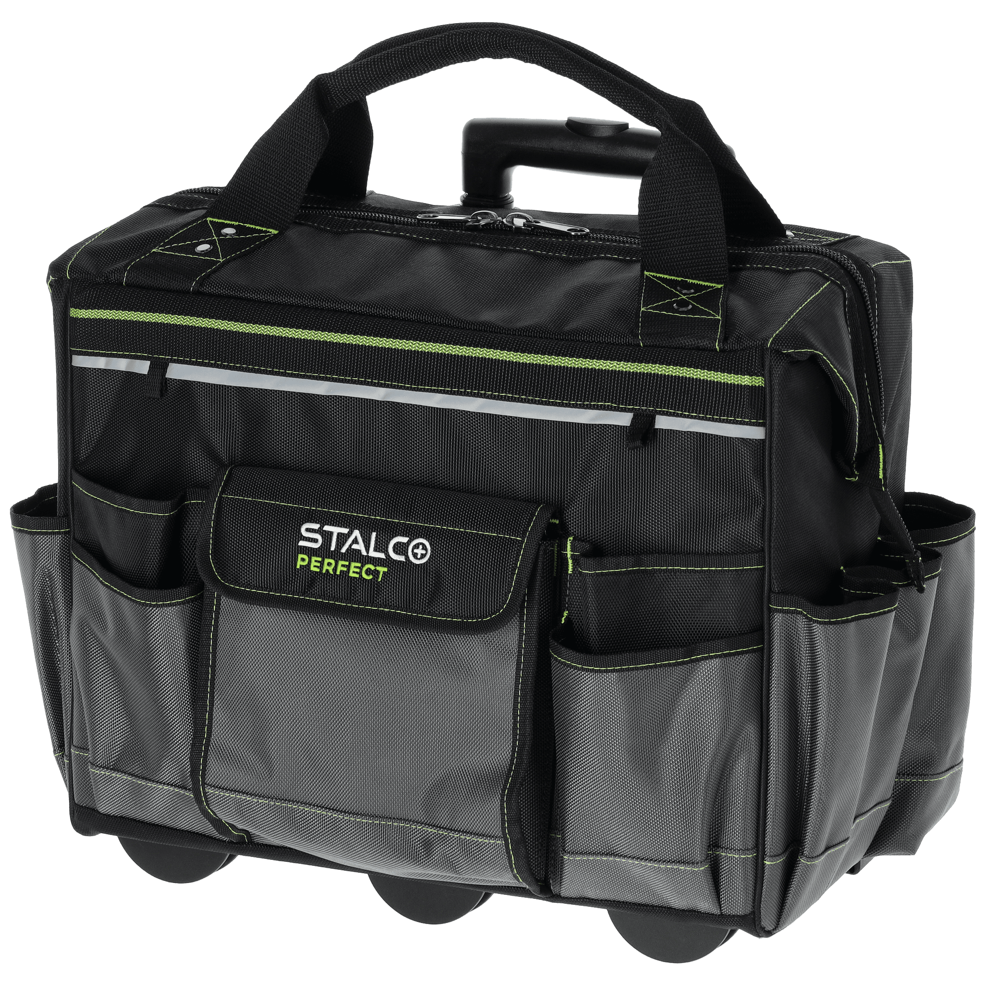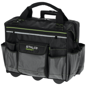 Torba narzędziowa "TNP10L" pozwala na bezpieczne przechowywanie narzędzi roboczych. Sprawdza się przy naprawach i pracach serwisowych wykonywanych w terenie. Dla poprawy widoczności została wykończona elementami odblaskowymi. Torba ma duże gabaryty i liczne wzmocnienia, dlatego można wykorzystywać ją do transportu wielu narzędzi, także o dużych rozmiarach. Sztywna konstrukcja i 6 funkcjonalnych wewnętrznych kieszeni ułatwiają utrzymanie porządku wewnątrz. Z kolei podczas pracy sprawdzi się 11 pojemnych kieszonek zewnętrznych. Produkt wykonano z trwałej i wytrzymałej tkaniny poliestrowej. Główna komora jest zapinana za pomocą mocnego zamka przeszytego podwójnym wzmocnionym ściegiem. Można przenosić torbę za pomocą uchwytów w górnej części, których mocowanie jest wzmocnione nitami. Torba z linii STALCO Perfect ma także wzmocniony teleskopowy uchwyt i plastikowe koła w dolnej części. Komplet przeznaczony jest do holowania mocno obciążonej torby i objętościowych produktów. Stelaż z kołami jest kompatybilny z torbami TNP10M i TNP10S, dlatego mozna potraktować go także jako podstawę dla tych mniejszych produktów.