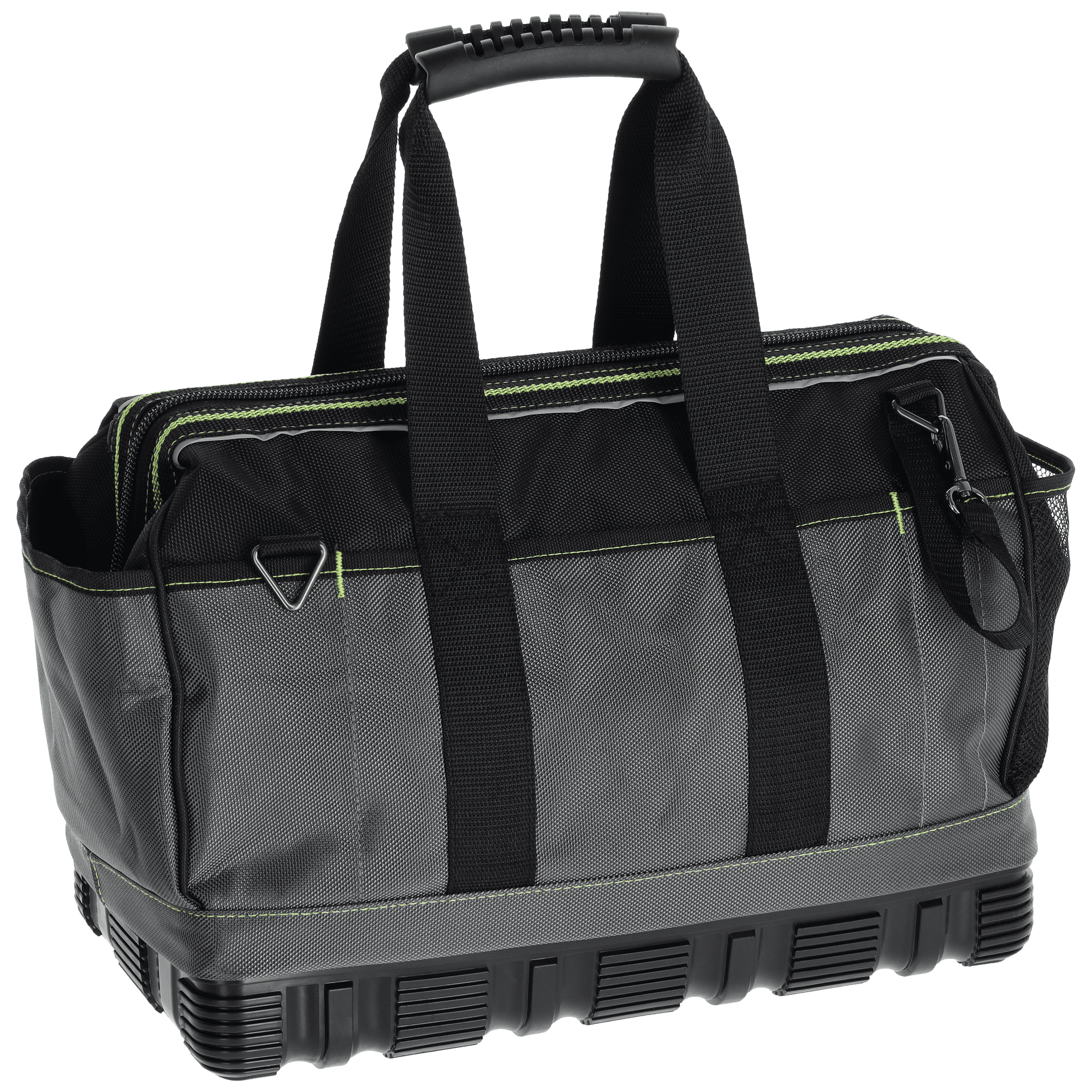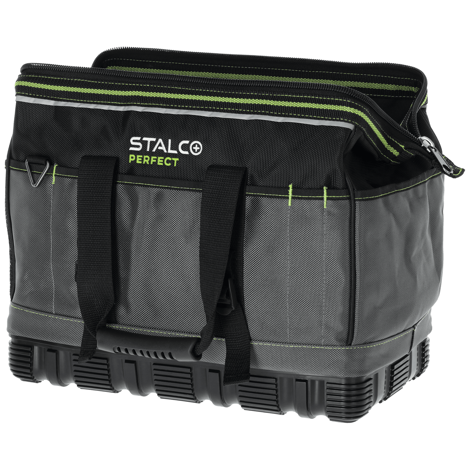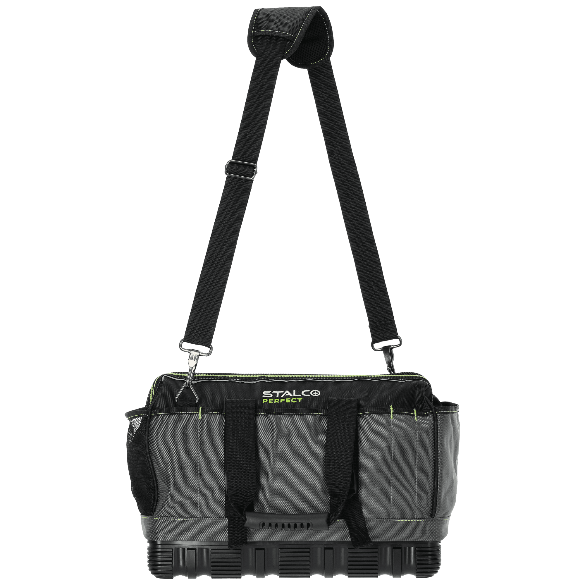 Torba narzędziowa "TNP16" jest produktem przydatnym przy pracy monterów i serwisantów. Została wykonana z myślą o pracy w trudnych warunkach na placu budowy lub w terenie. Głęboki środek ułatwi szczególnie przechowywanie elektronarzędzi . Do jej produkcji zastosowano wzmocniony materiał poliestrowy odporny na przetarcie, pękanie, wilgoć, a także niesprawiający problemów w utrzymaniu czystości. Większą trwałość i żywotność produktu zapewnia mocna plastikowa podstawa. Całość jest zapinana za pomocą solidnego zamka. Torba z linii STALCO Perfect służy do transportu narzędzi i ułatwia utrzymanie ich w porządku. Wewnątrz sztywnej konstrukcji głównej komory znalazło się 8 pojemnych kieszeni. Na zewnątrz umieszczono kolejnych 11 kieszeni, a także klamrę i karabinek na narzędzia. Do transportu torby w dłoniach służy podwójny uchwyt w górnej części. Dodatkowo torba jest wyposażona w regulowany pasek na ramię z wygodną nakładką.