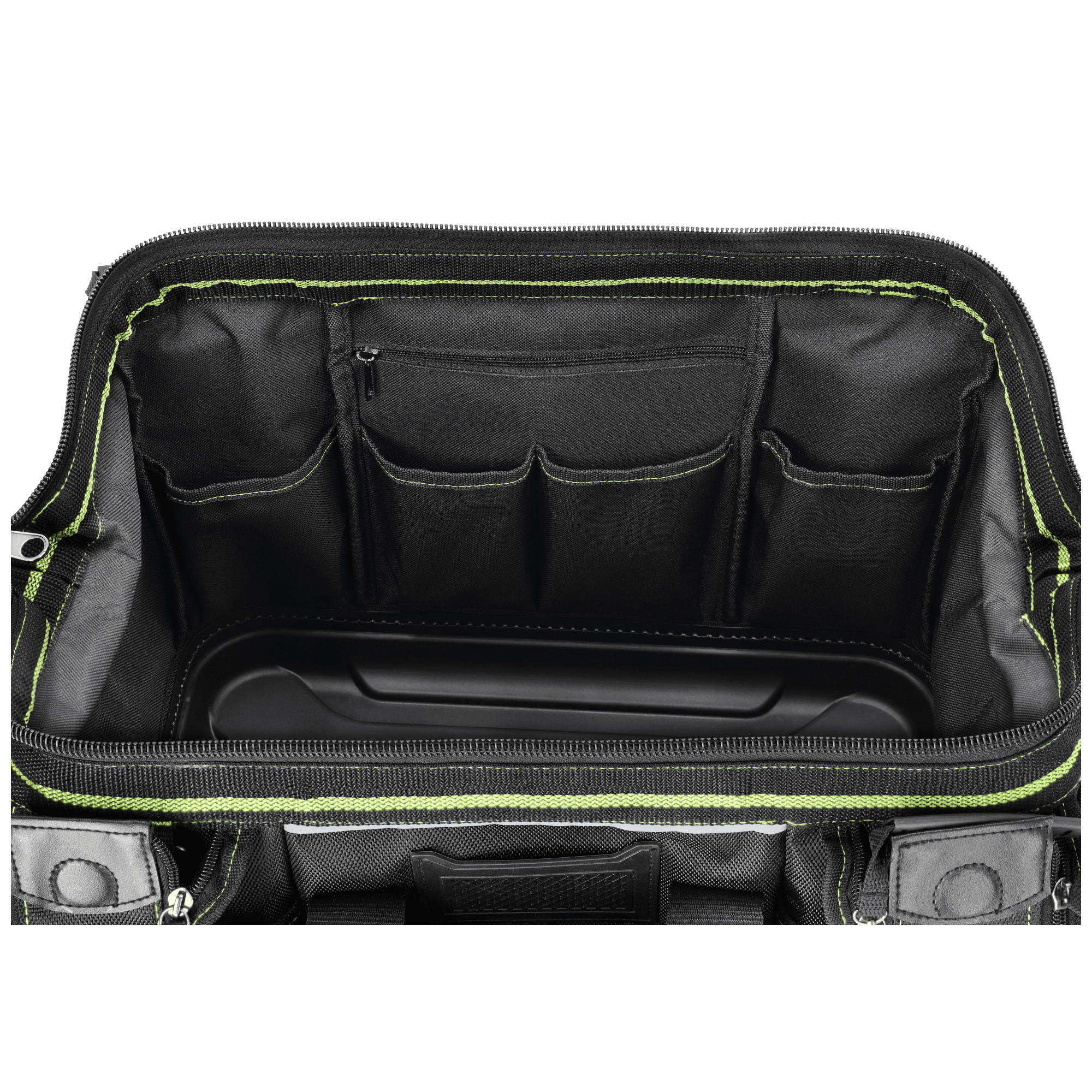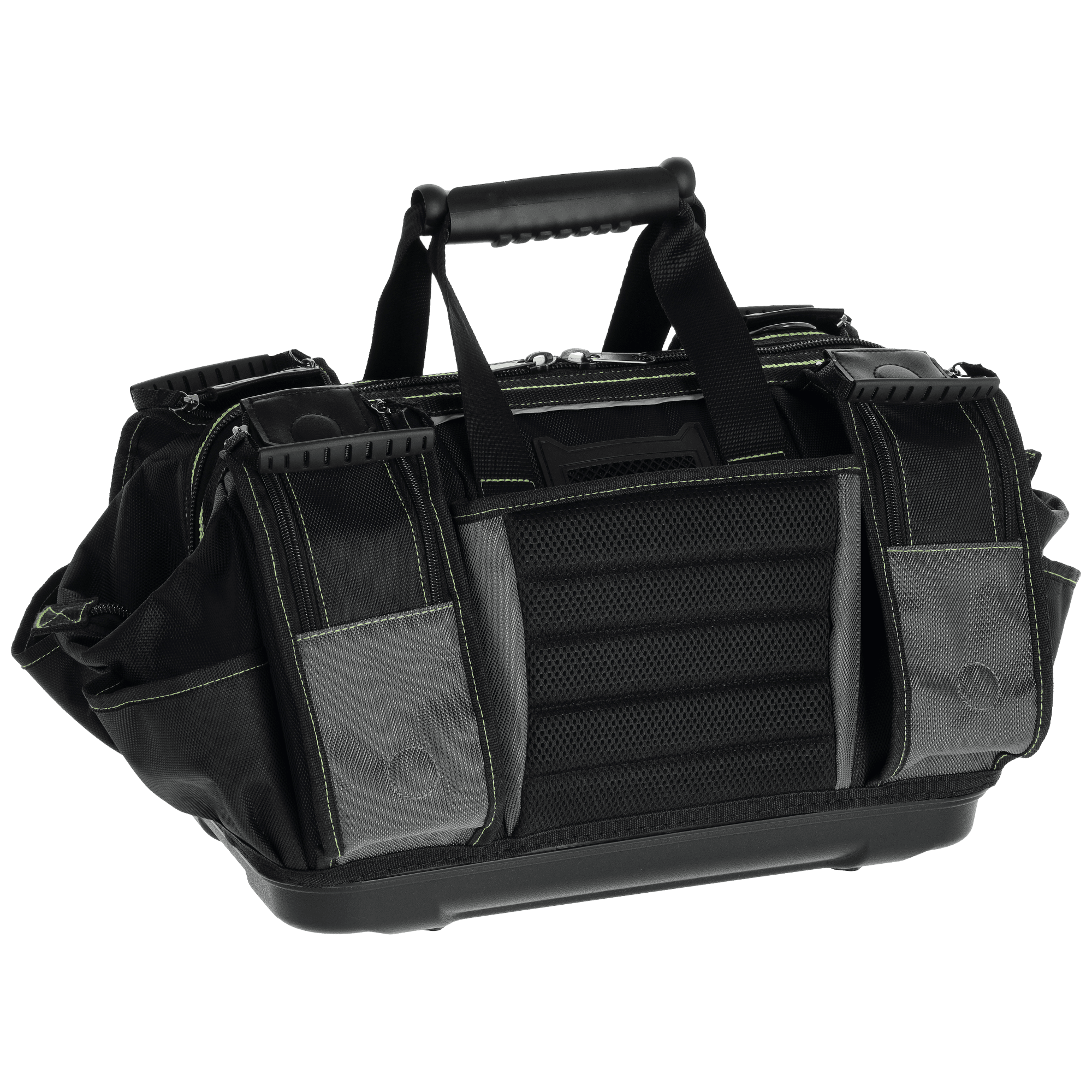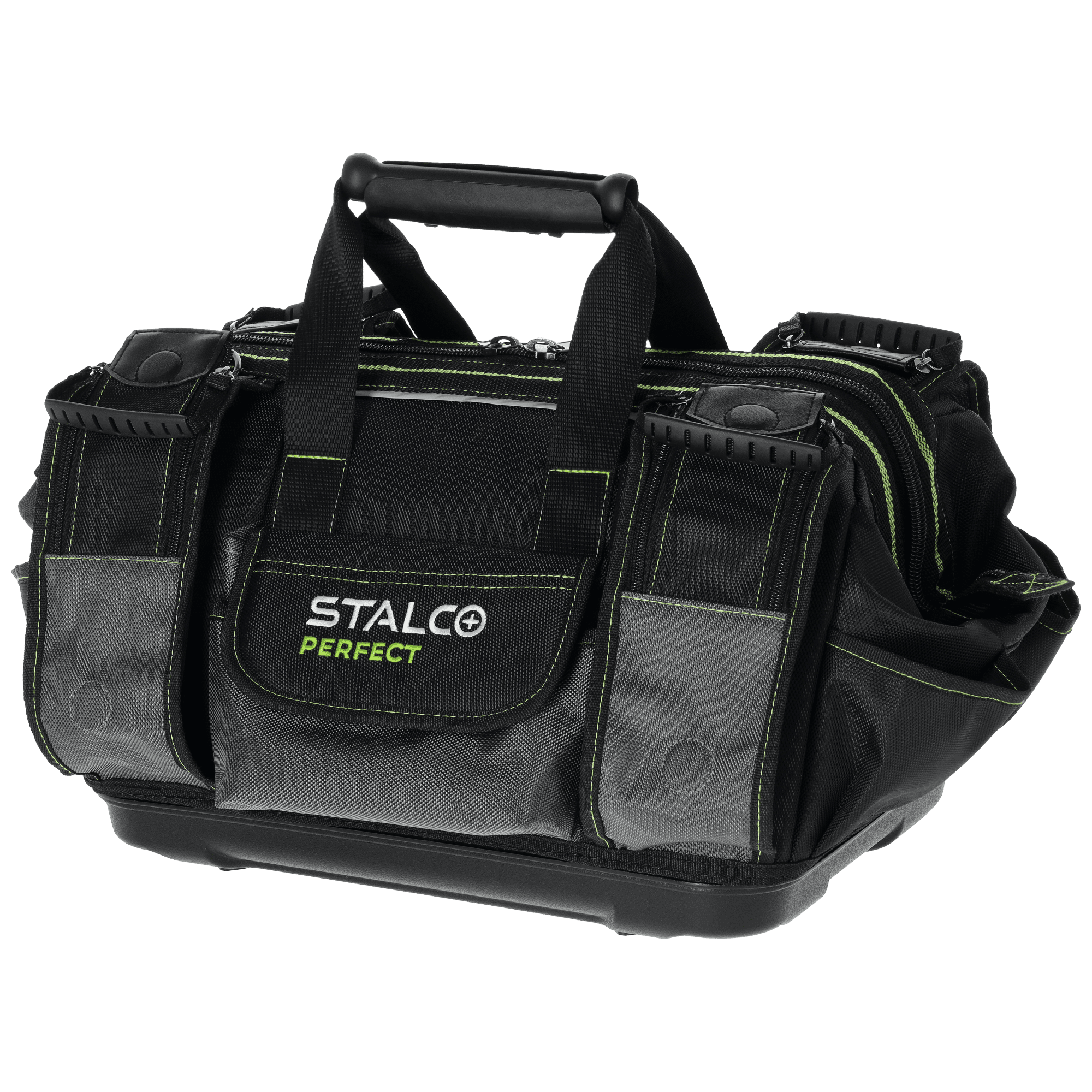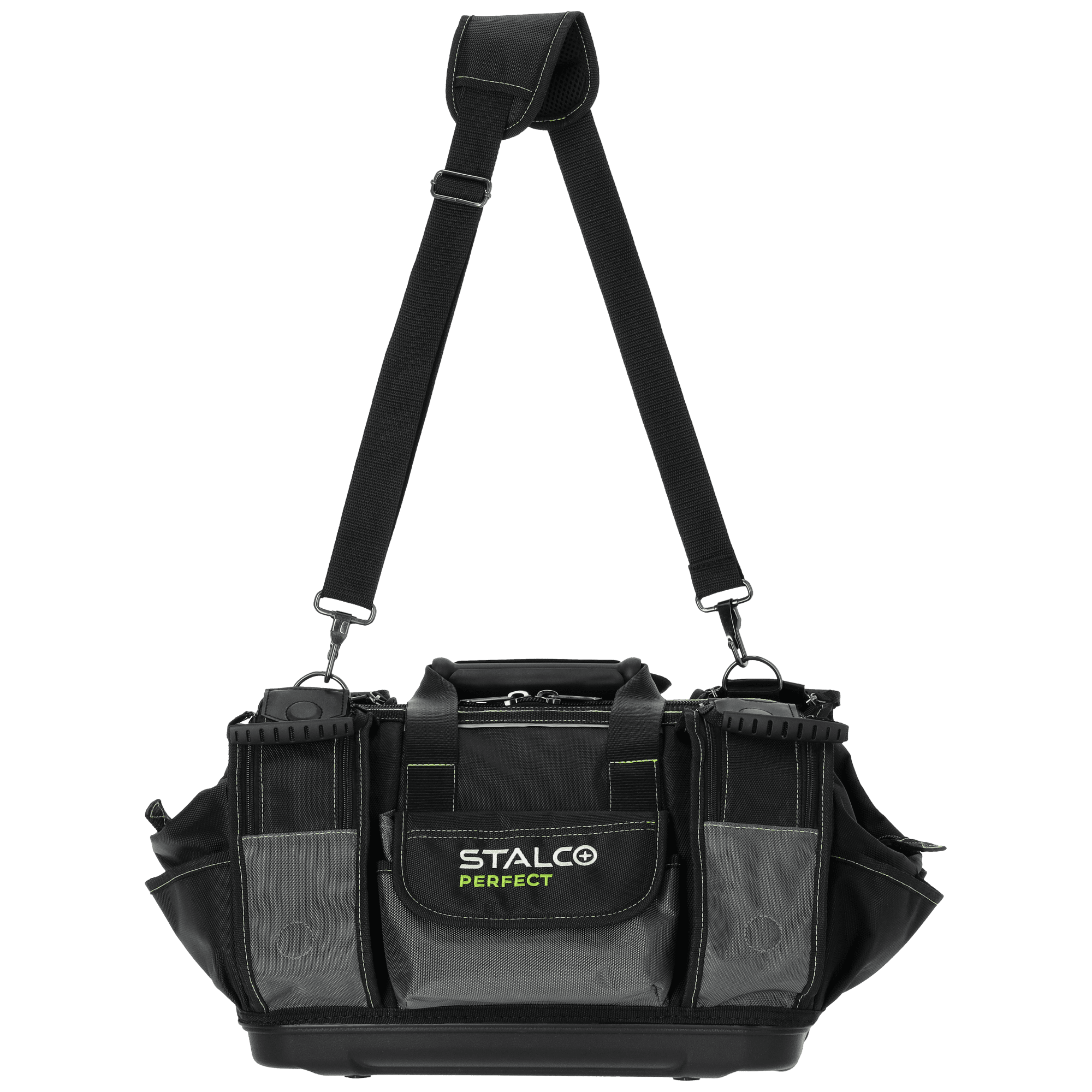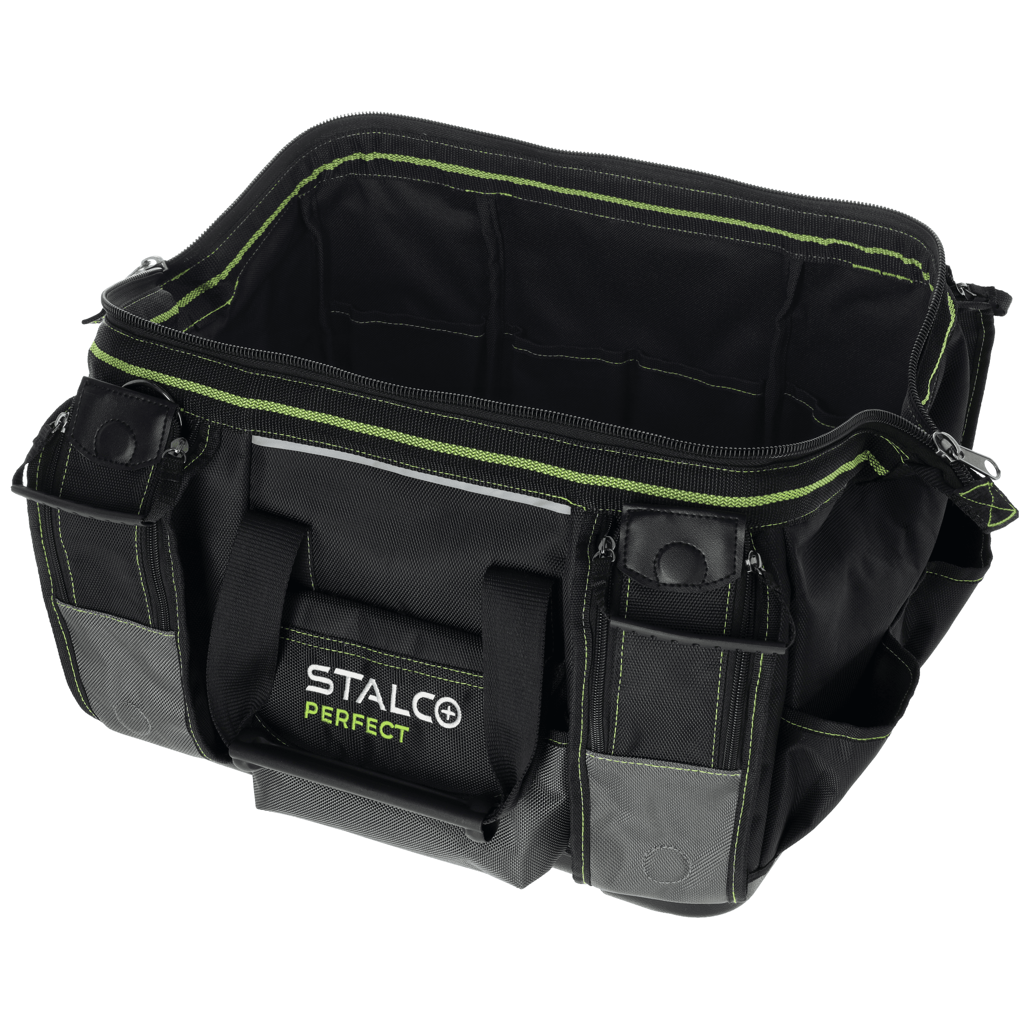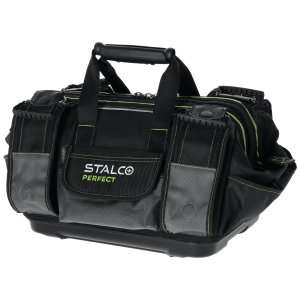Wysokiej jakości "TNP18" to profesjonalne akcesorium pomocne przy pracach monterskich, serwisowych i ogólnobudowlanych. Została przygotowana z myślą o trudnych warunkach panujących w tych branżach. Do wyszycia torby wykorzystano solidną tkaninę poliestrową o dobrych parametrach użytkowych i wytrzymałościowych. Podstawa jest wzmocniona tworzywem sztucznym, a konstrukcja torby usztywniona. Do zapięcia głównej komory służy mocny i trwały zamek, który został wzmocniony podwójnym szwem. W górnej części znajduje się uchwyt do przenoszenia. Torbę z linii STALCO Perfect można również nosić na ramieniu, do czego służy regulowany pasek zapinany za pomocą mocnego nabijanego karabińczyka. Przy projektowaniu torby równolegle z trwałością postawiono na funkcjonalność. Wewnątrz sztywnej konstrukcji znalazło się 9 kieszeni. Z kolei na zewnątrz umieszczono 10 kieszeni na drobne przedmioty i dodatkową na identyfikator. Na zewnątrz znalazło się kilka elementów odblaskowych dla poprawy widoczności w ciemnych pomieszczeniach.