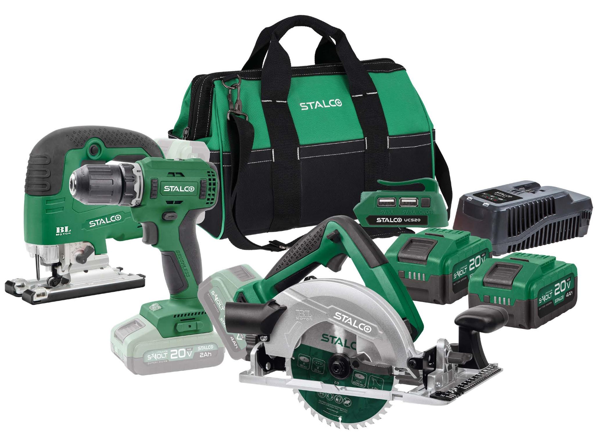 W komplecie znalazły się następujące akcesoria: Torba narzędziowa Stalco, Pilarka Tarczowa ręczna Akumulatorowa, Wyrzynarka Akumulatorowa, Wiertarko-wkrętarka Akumulatorowa, ładowarki 4A 20V 100W i USB, a także dwa Akumulatory 20V 4Ah BLS20-4AH.