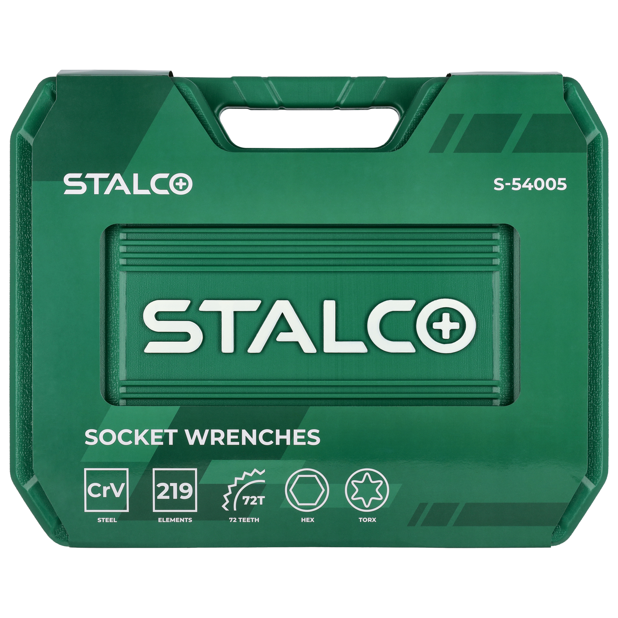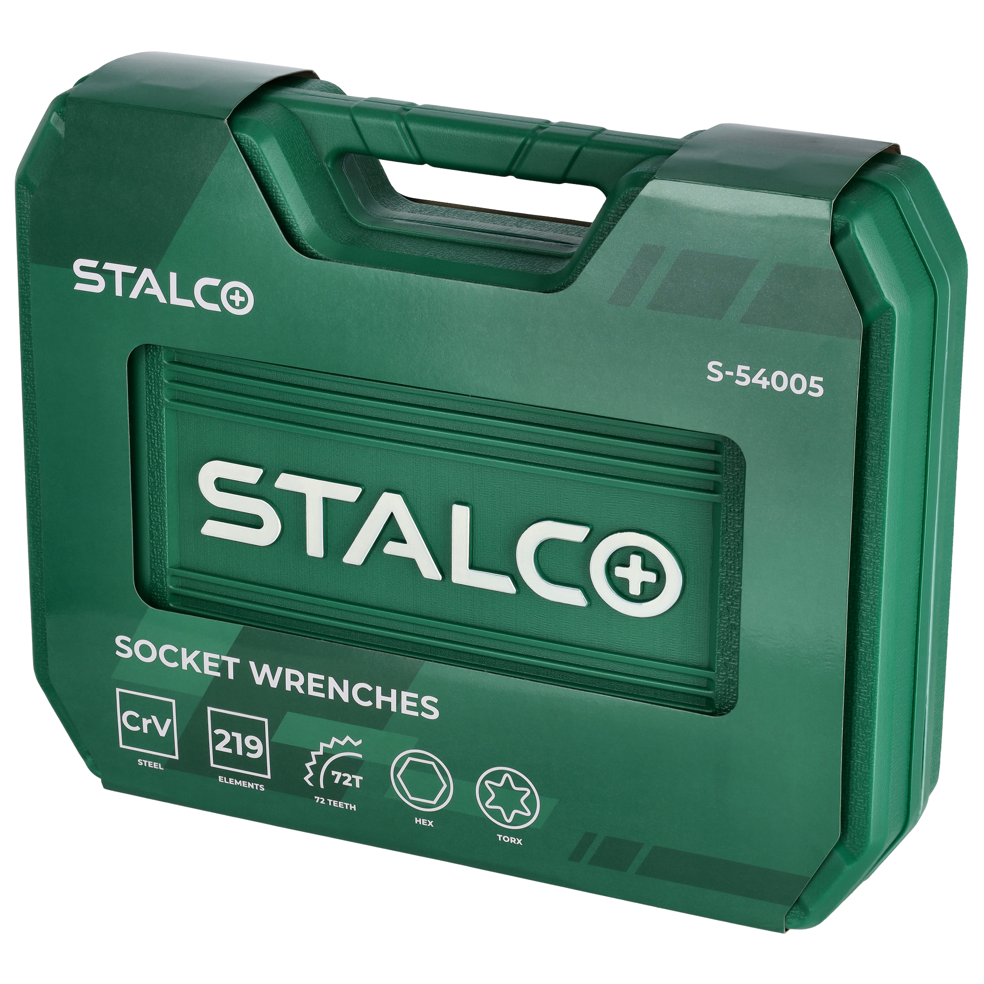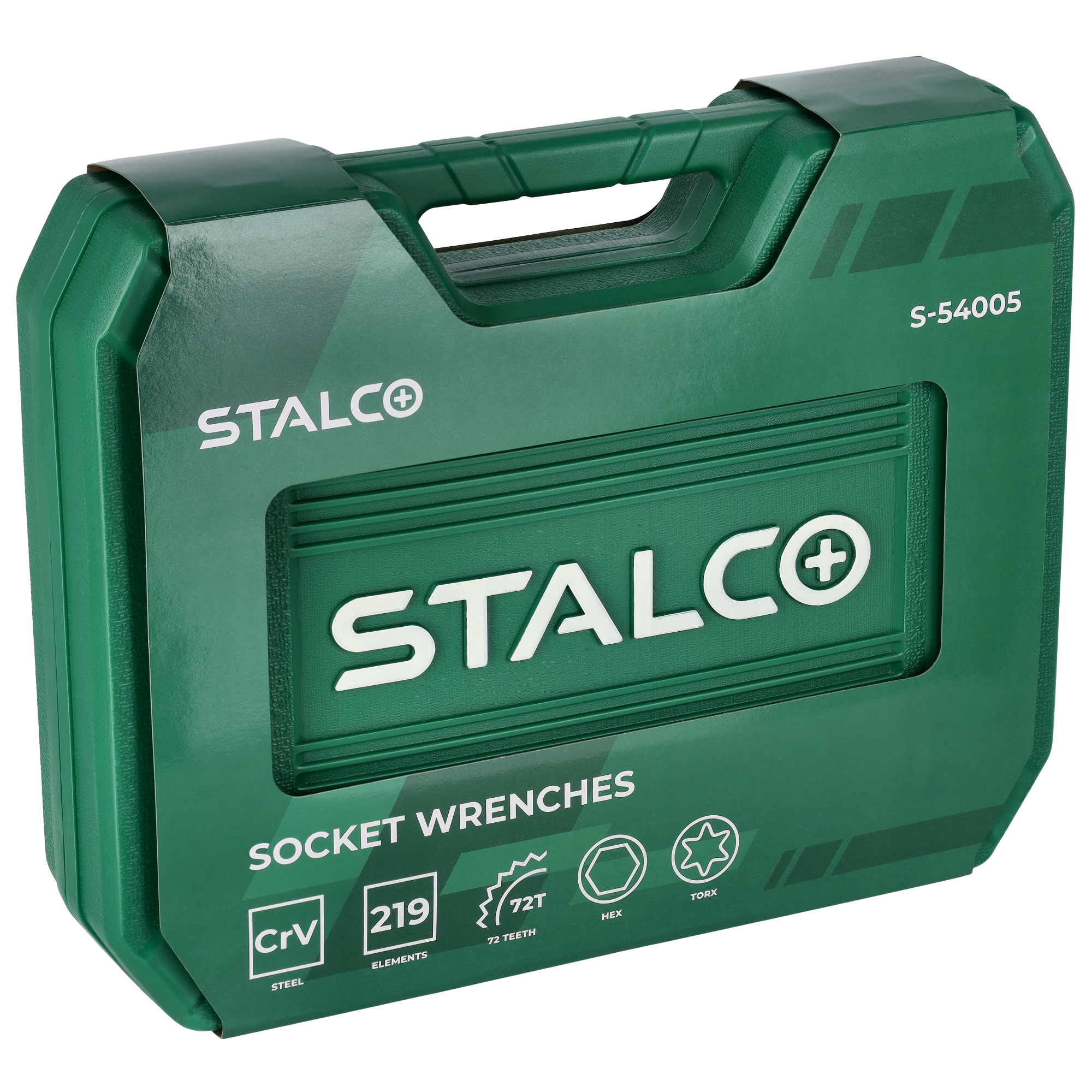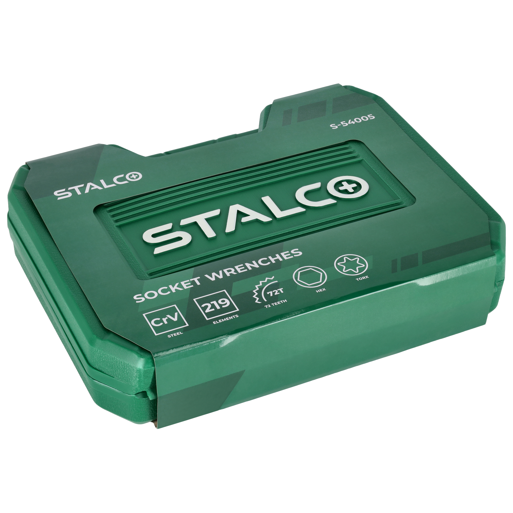 Rozbudowany zestaw kluczy nasadowych i płasko-oczkowych będzie przydatny w każdym warsztacie. Zawiera 219 elementów, co stanowi jedną z najobszerniejszych kompozycji w całej ofercie narzędzi STALCO. W jego skład wchodzą akcesoria i narzędzia potrzebne do operowania przy śrubach i wkrętach. Można dopasować elementy pasujące do akcesoriów złącznych zakończonych gniazdami i uchwytami w różnych kształtach oraz rozmiarach. Zestaw kluczy nasadowych i płasko-oczkowych zawiera komplet nasadek na śruby o wymiarach od 4 do 32 mm. Nasadki pasują na trzpienie o wymiarach 1/4, 3/8 i 1/2 cala. Są też dostępne w dwóch wariantach długości. Do obsługi wkrętów i służą bity płaskie, krzyżakowe, a także typu TORX. Komplet uzupełniają klucze oczkowo-płaskie, grzechotki, wkrętak i szereg dodatkowych akcesoriów do obsługi narzędzi. Wszystkie elementy umieszczone są w walizce z tworzywa sztucznego zapinanej na klamry.