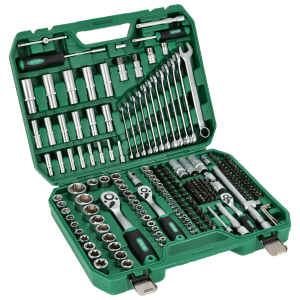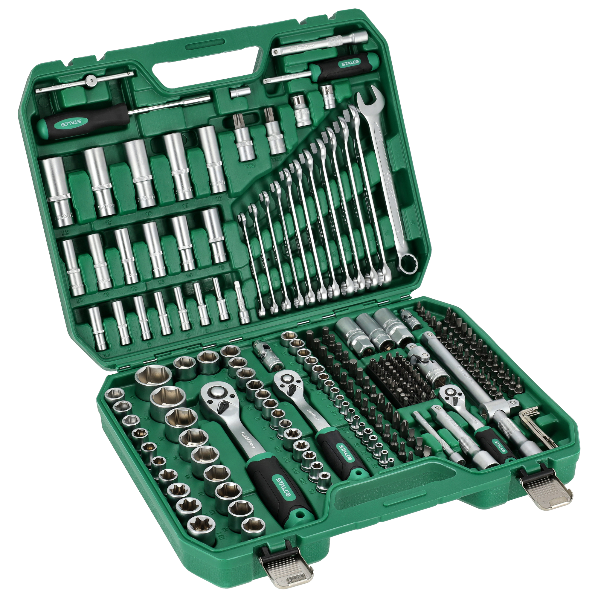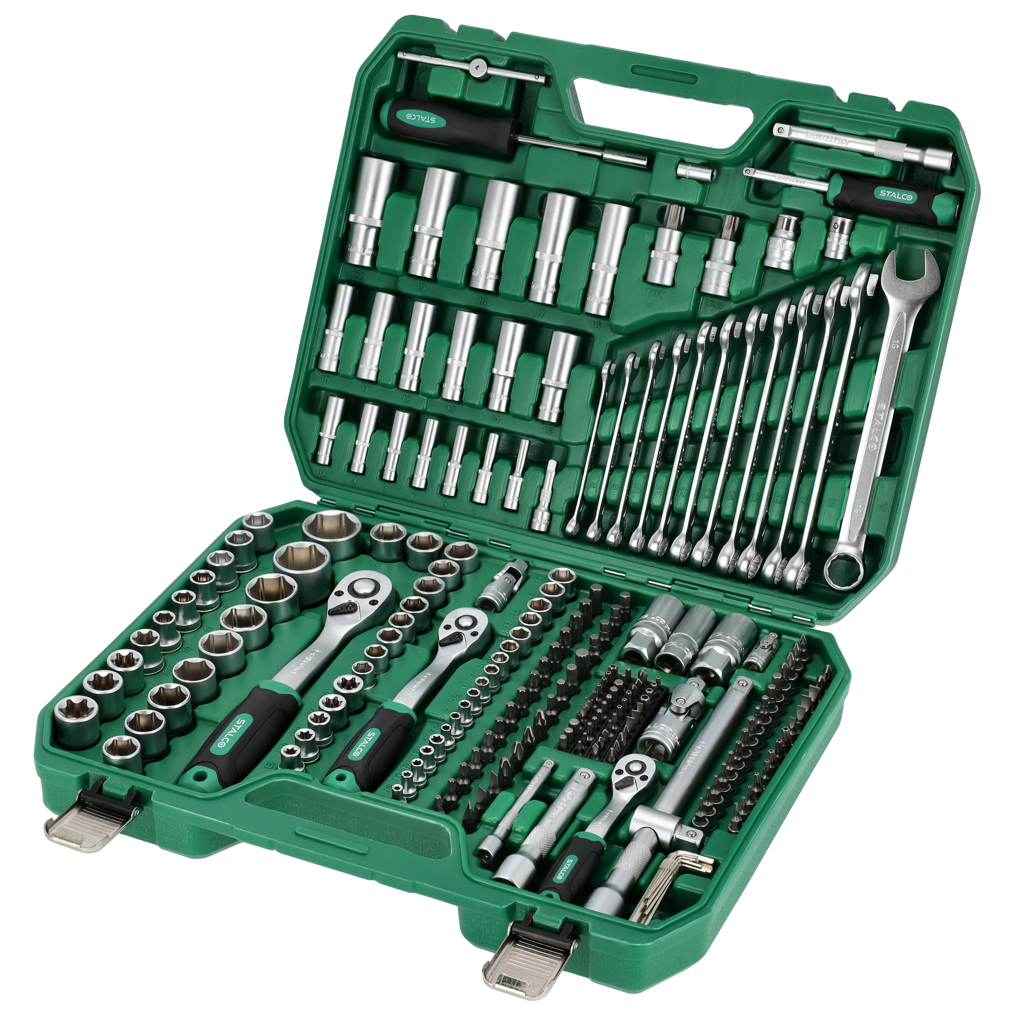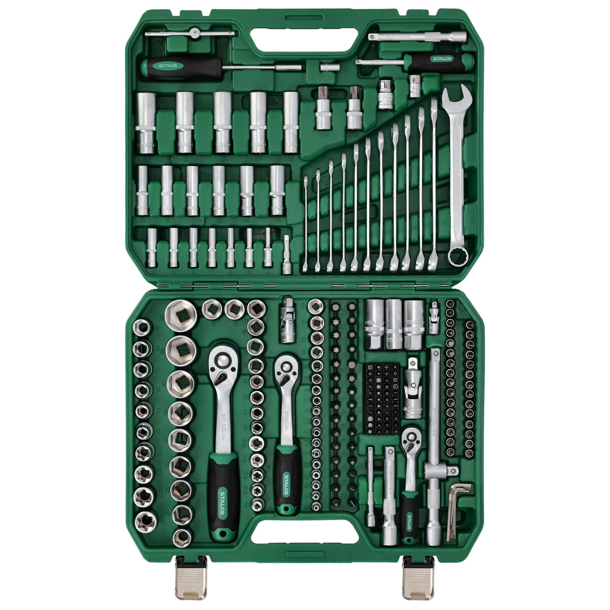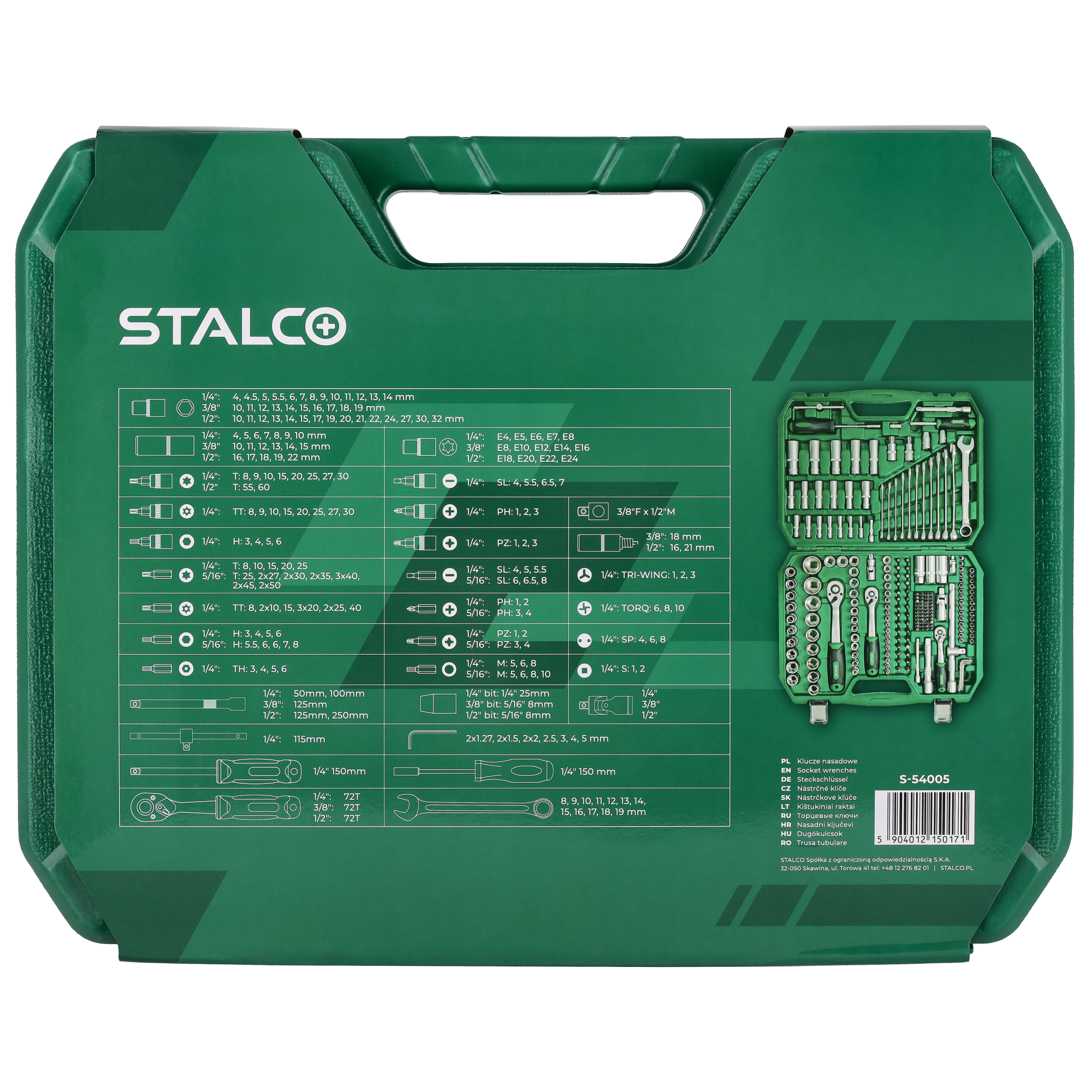 Rozbudowany zestaw kluczy nasadowych i płasko-oczkowych będzie przydatny w każdym warsztacie. Zawiera 219 elementów, co stanowi jedną z najobszerniejszych kompozycji w całej ofercie narzędzi STALCO. W jego skład wchodzą akcesoria i narzędzia potrzebne do operowania przy śrubach i wkrętach. Można dopasować elementy pasujące do akcesoriów złącznych zakończonych gniazdami i uchwytami w różnych kształtach oraz rozmiarach. Zestaw kluczy nasadowych i płasko-oczkowych zawiera komplet nasadek na śruby o wymiarach od 4 do 32 mm. Nasadki pasują na trzpienie o wymiarach 1/4, 3/8 i 1/2 cala. Są też dostępne w dwóch wariantach długości. Do obsługi wkrętów i służą bity płaskie, krzyżakowe, a także typu TORX. Komplet uzupełniają klucze oczkowo-płaskie, grzechotki, wkrętak i szereg dodatkowych akcesoriów do obsługi narzędzi. Wszystkie elementy umieszczone są w walizce z tworzywa sztucznego zapinanej na klamry.