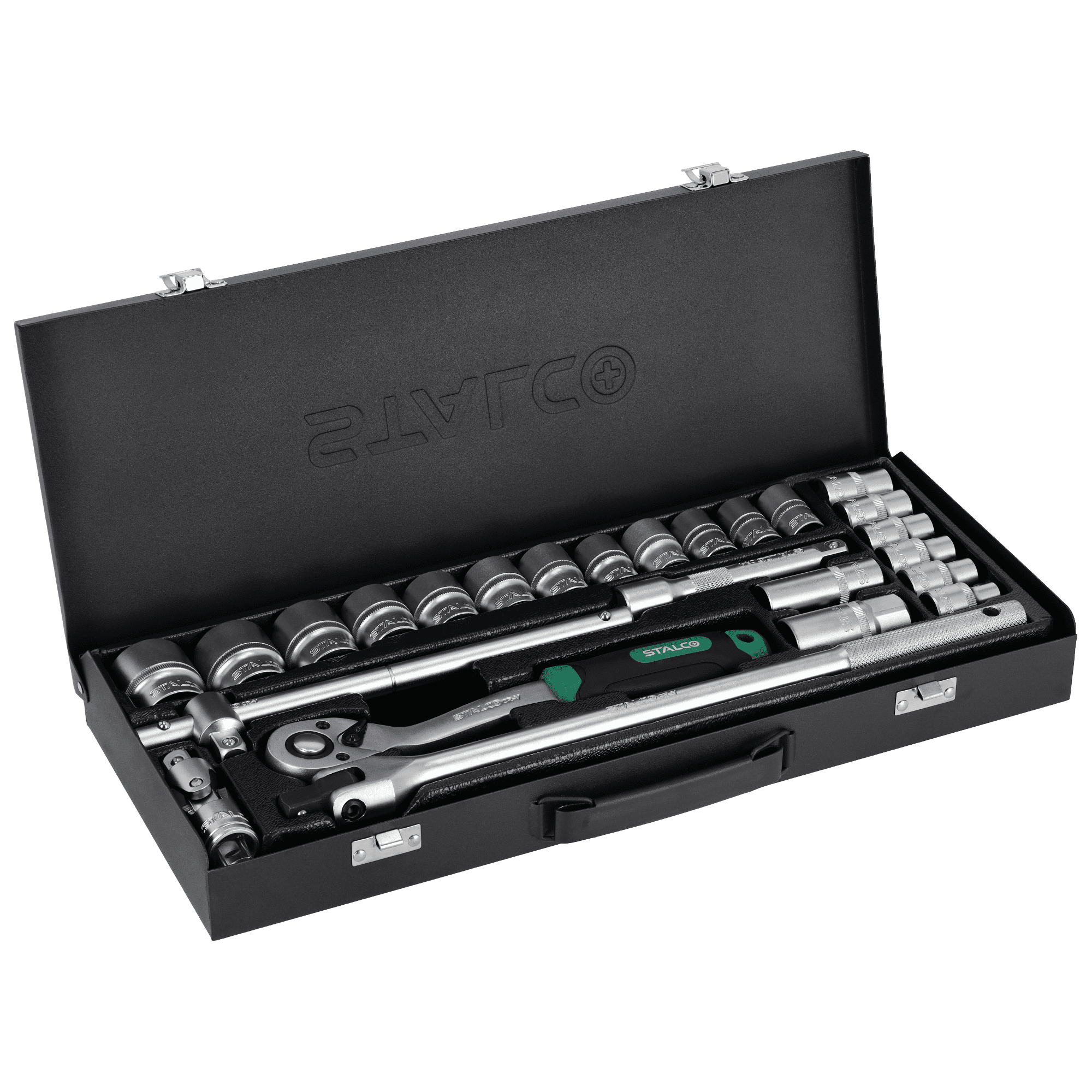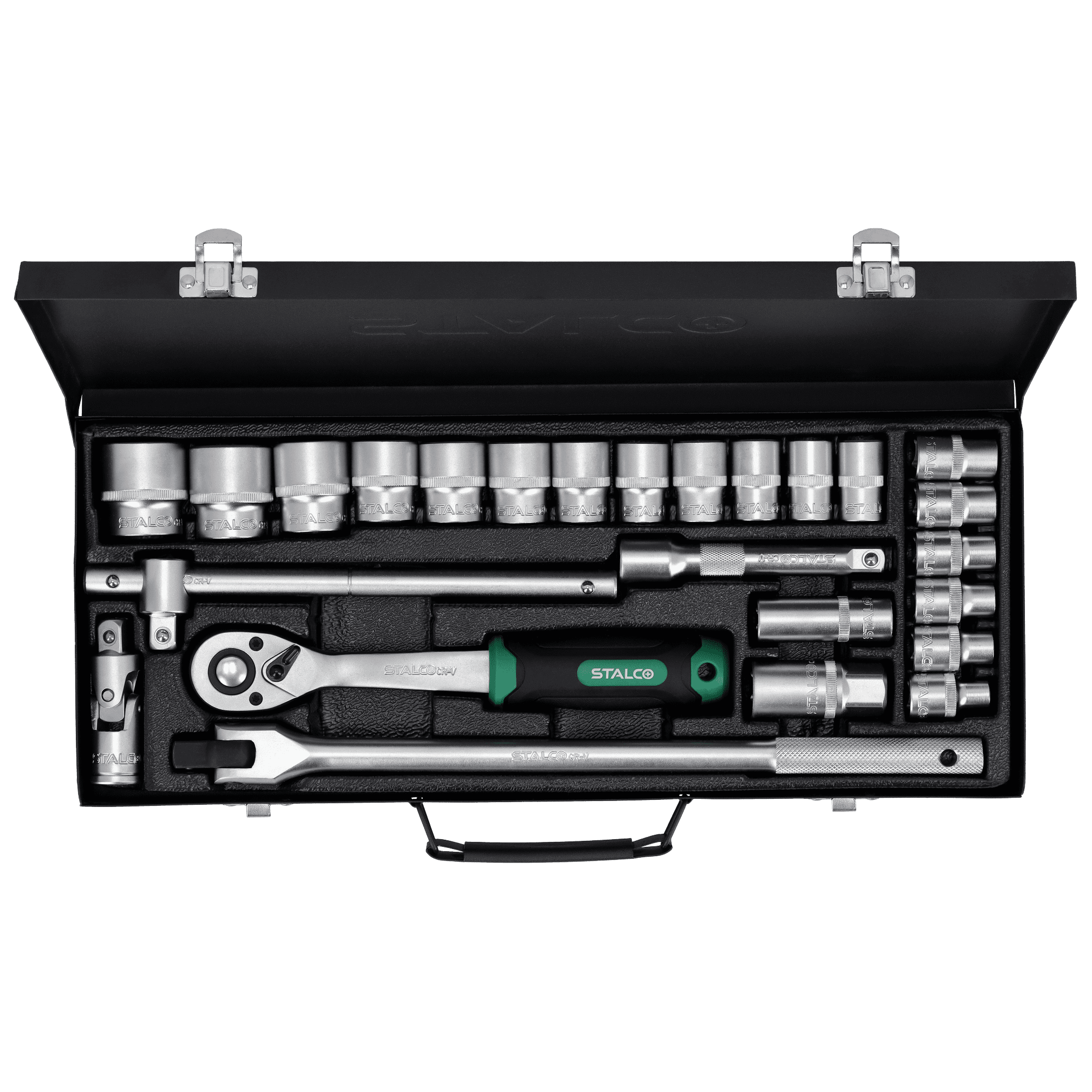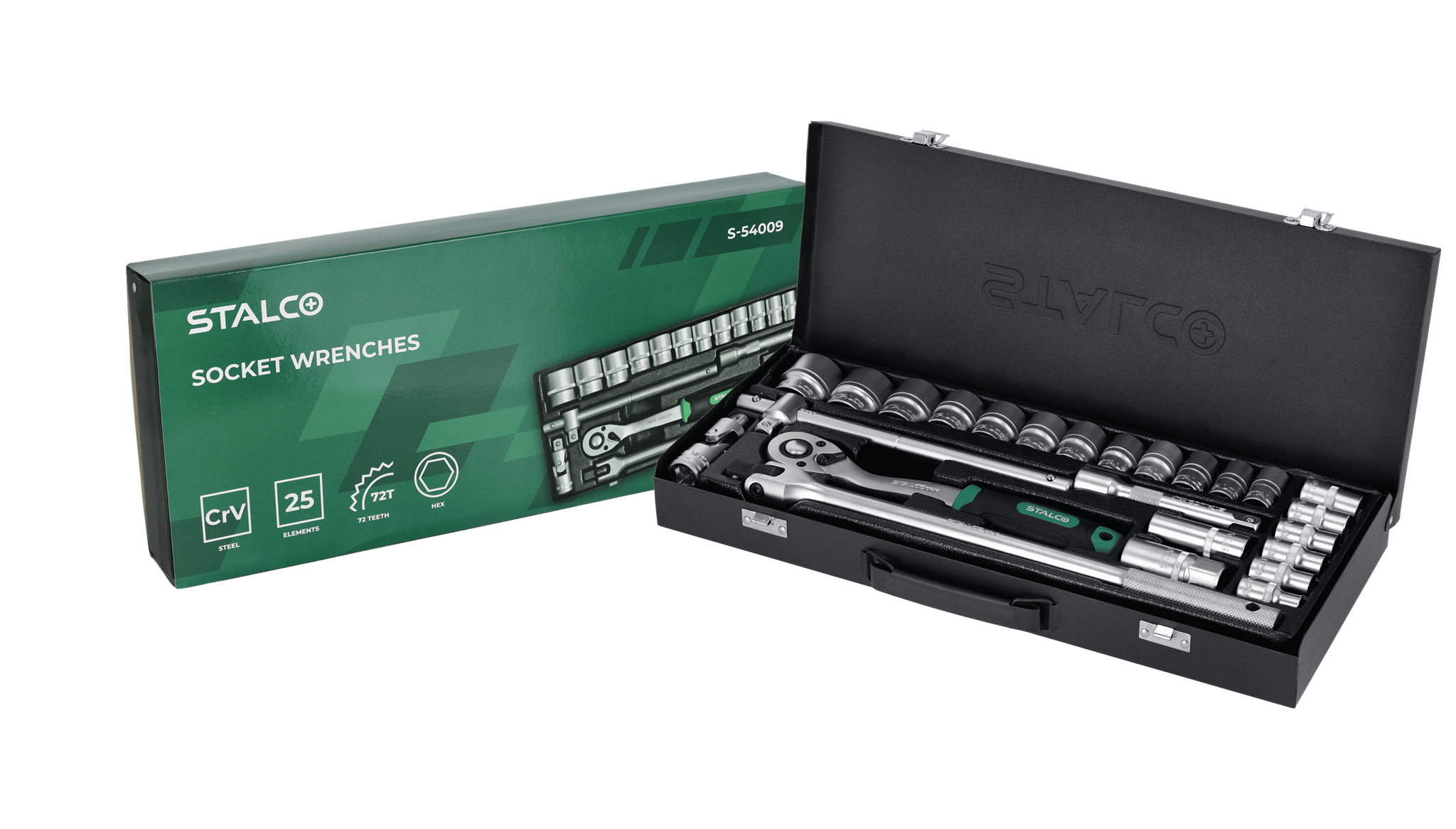 Niewielki zestaw kluczy nasadowych uzupełni asortyment każdego warsztatu. Znajdują się w nim akcesoria przeznaczone do operowania przy elementach złącznych gwintowanych. Kilka narzędzi zamkniętych jest w opakowaniu z tworzywa sztucznego. Małe pudełko można umieścić w szufladzie warsztatowej, na pace samochodu serwisowego lub w domowej skrzyni narzędziowej. Zestaw kluczy nasadowych STALCO składa się 18 końcówek nasadkowych pasujących na półcalowe trzpienie. W komplecie znalazła się precyzyjna grzechotka z ergonomicznym uchwytem. Komplet uzupełniają akcesoria przydatne do wykonywania prac w trudno dostępnych miejscach. Do produkcji narzędzi i akcesoriów z zestawu zastosowano dobry wytop stali CrV. To zapewnia im odporność na uszkodzenia mechaniczne i korozję, a także długą żywotność.