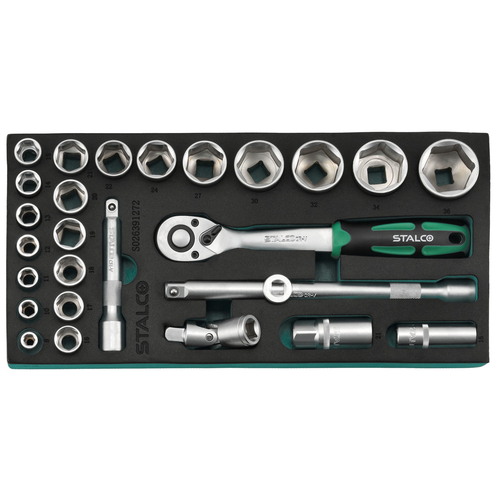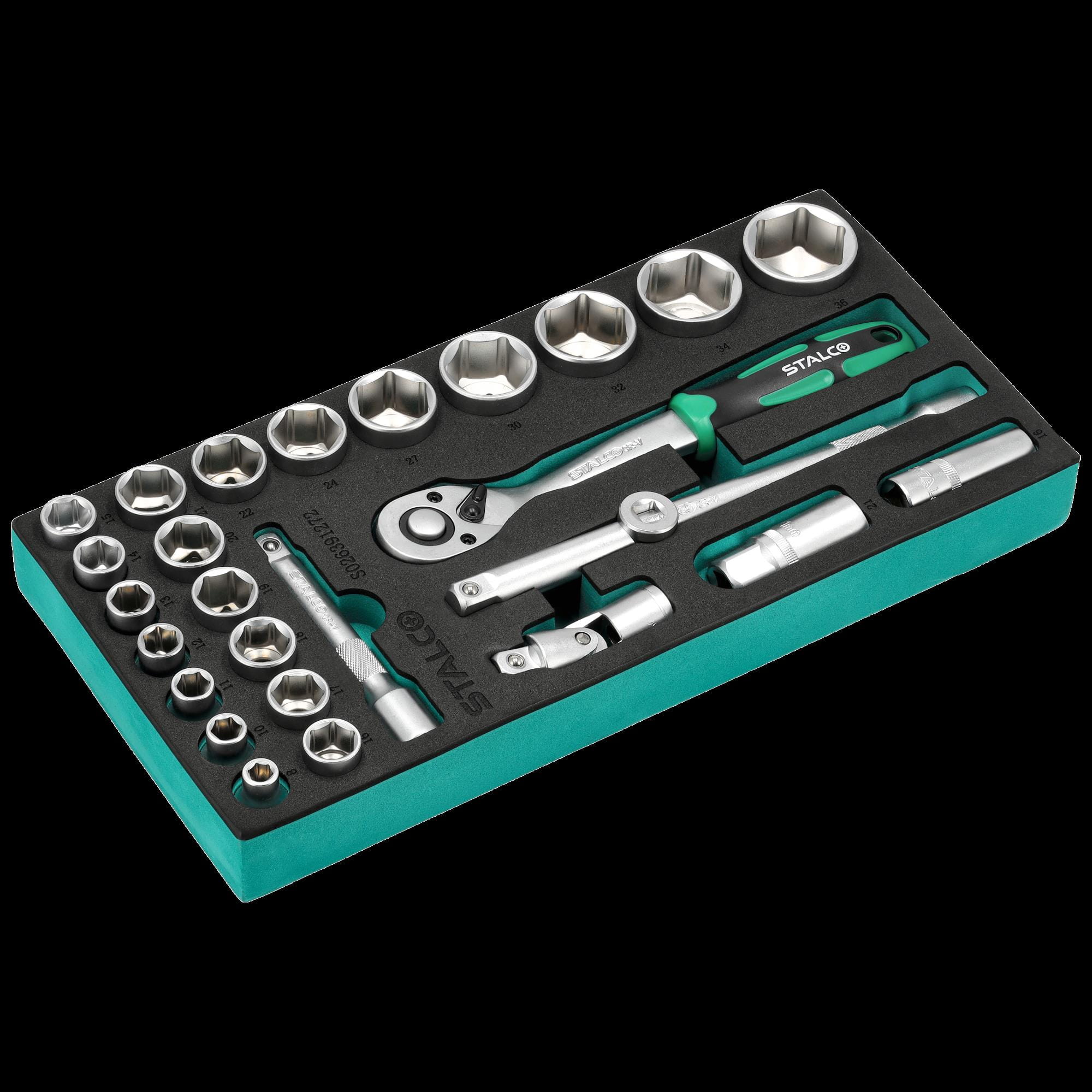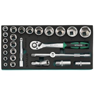Wkładka z pianki EVA z kluczami nasadowymi w rozmiarze 1/2", przeznaczona do wszystkich szafek narzędziowych STALCO . Rozmiar 1/3 szuflady.